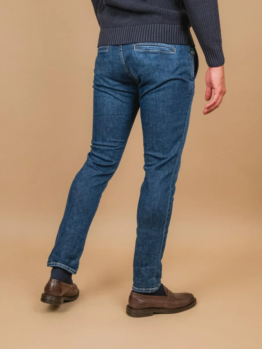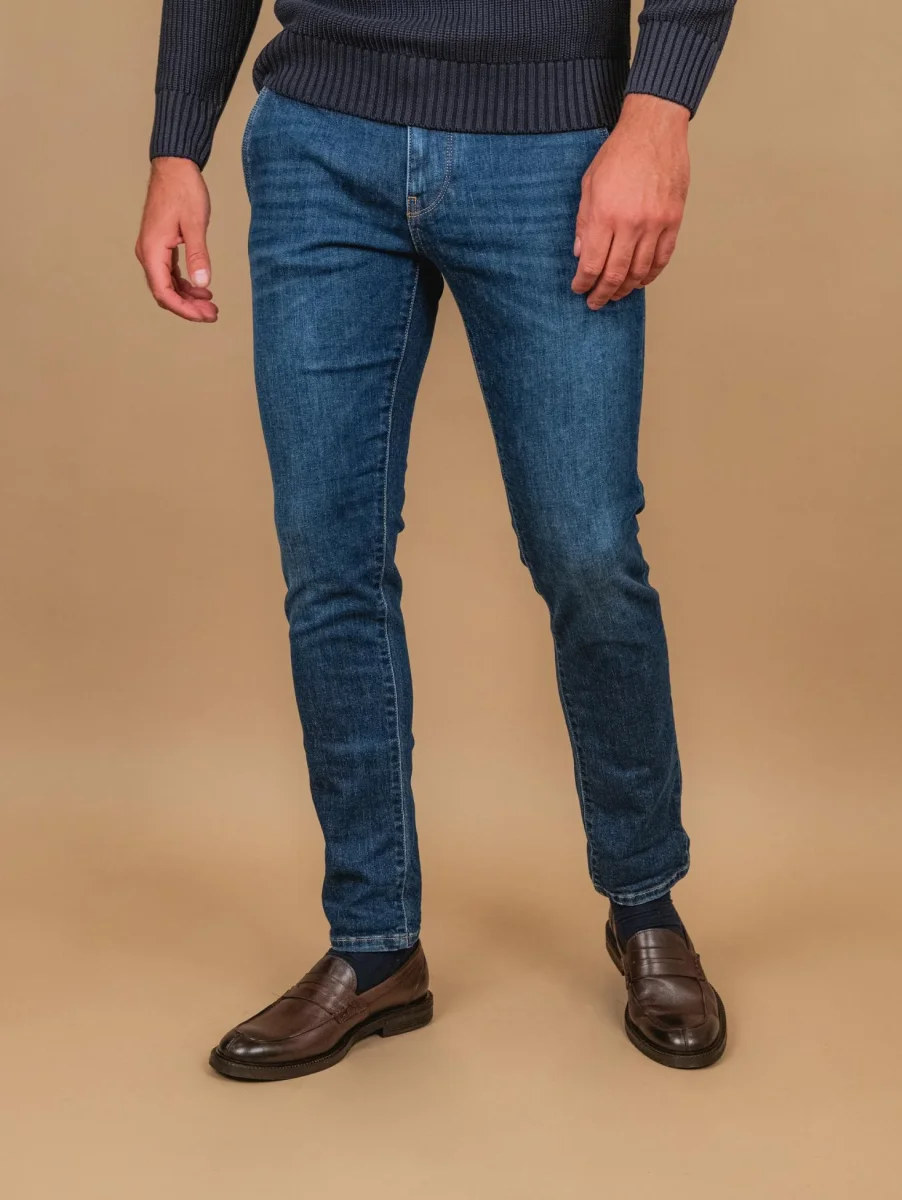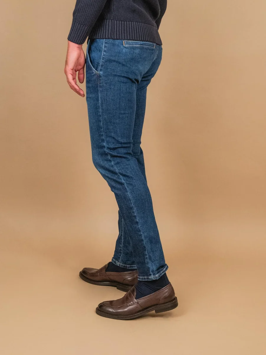 Jeans quattro tasche in denim scuro regular slim fit. Orlo alla caviglia regolabile a seconda delle preferenze. Peso medio. Composizione: 98% cotone 2% elastane. Il modello è alto 1.83 cm e indossa una 33.
