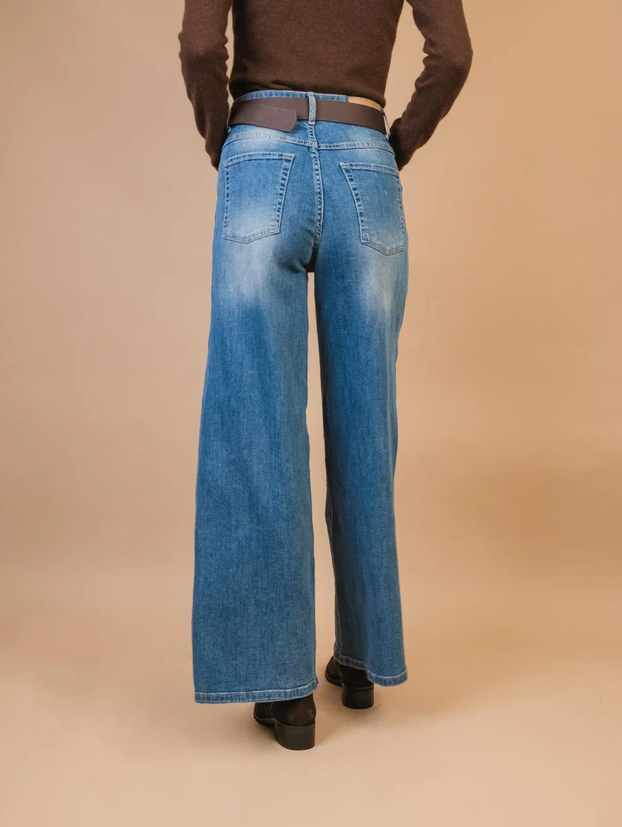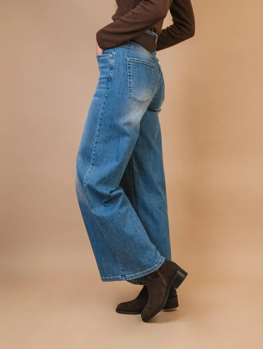 Jeans a palazzo chiaro con cintura in pelle a contrasto. Effetto slavato. 5 tasche. Vita alta. Gamba larga che rende la vestibilità di questo pantalone super comoda. Chiusura a bottoni frontale. Vestibilità regolare. Composizone: 99% cotone 1% elastane. Peso medio. La modella è alta 1.79 e indossa una XS.