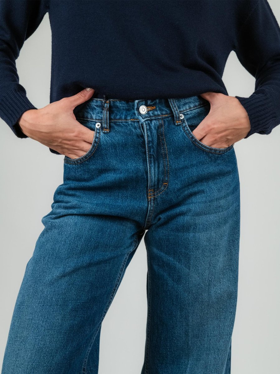 Jeans in tela denim crudo, resistente e fermo.