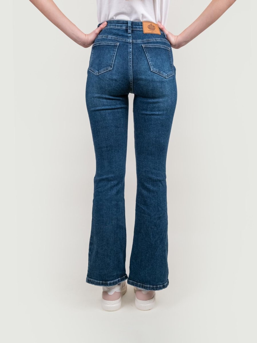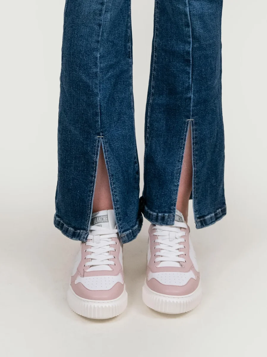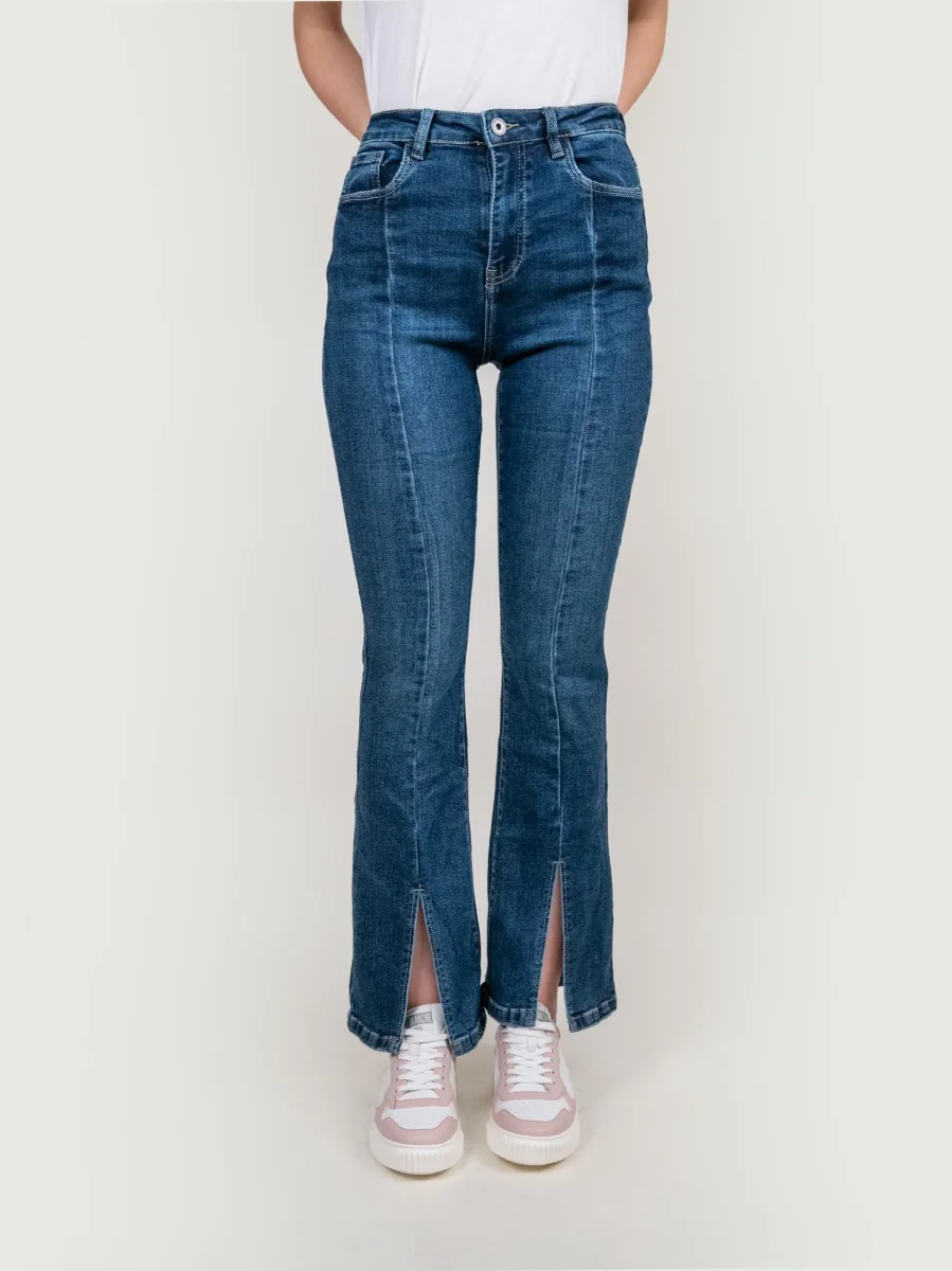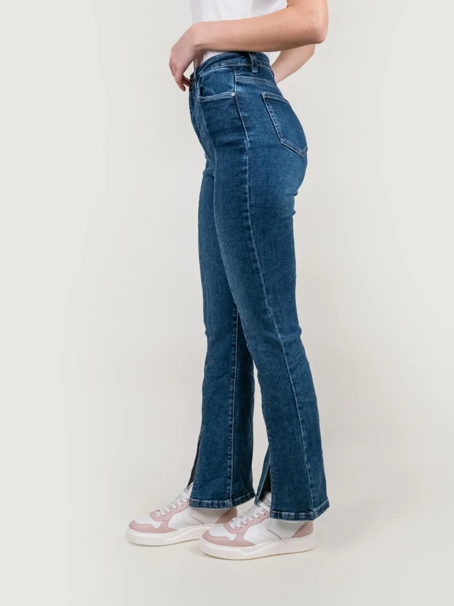 Jeans a zampa elasticizzato con maxi spacco frontale in cotone lavaggio denim scuro.