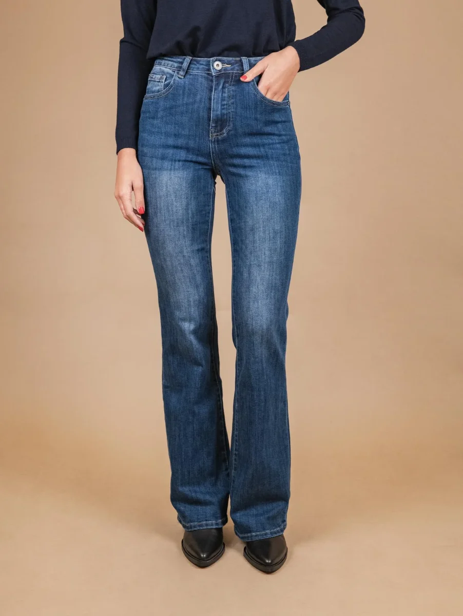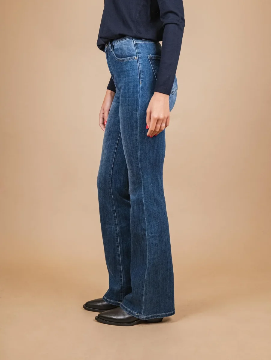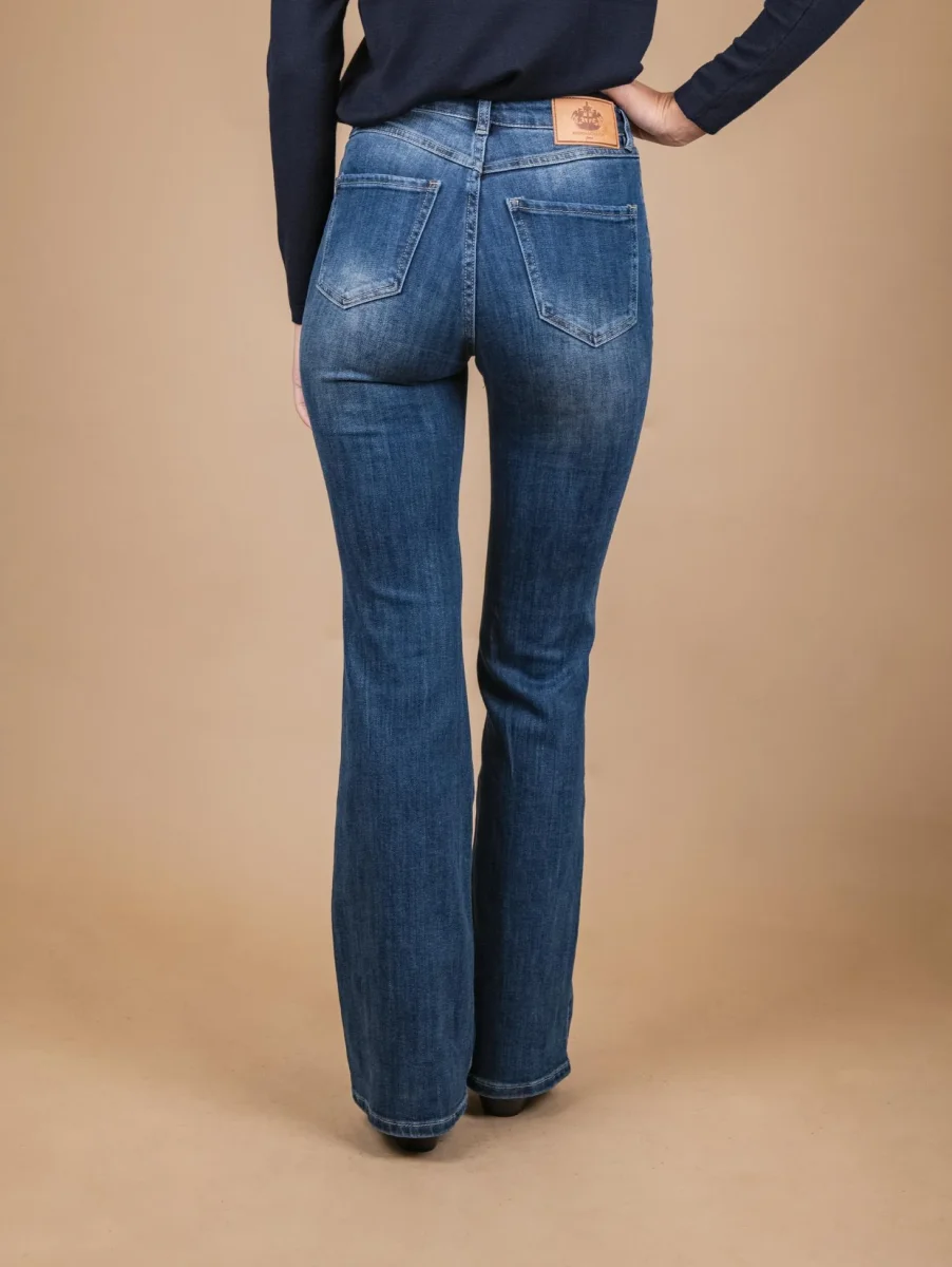 Jeans a zampa elasticizzato in denim scuro. Tessuto elasticizzato super confortevole già dal primo utilizzo. Vita alta. Cinque tasche. Dettaglio salpa con logo Andrea Morando e stemma di Genova. Vestibilità regolare. Peso medio. Composizione: 80% cotone, 13% poliestere, 4% rayon 3% elastane. La modella è alta 1.81 e indossa una S.
