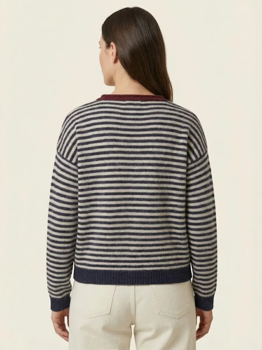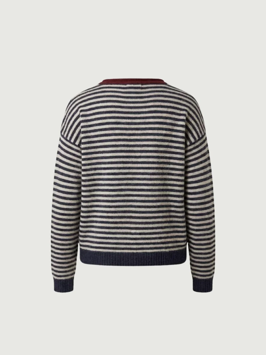 Maglia girocollo con fondo grigio e righe antracite.