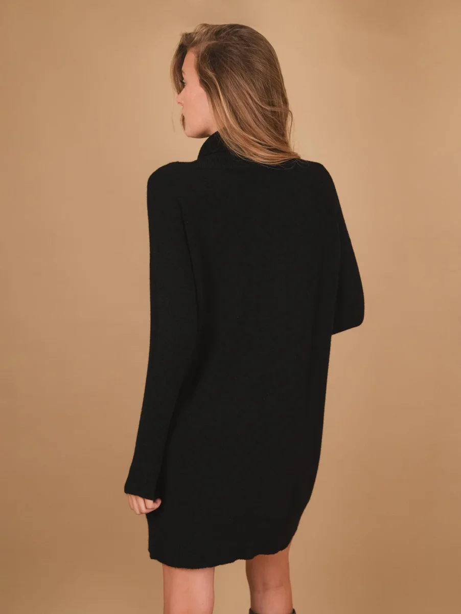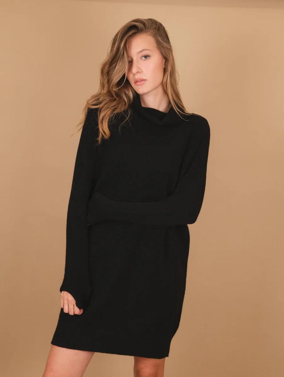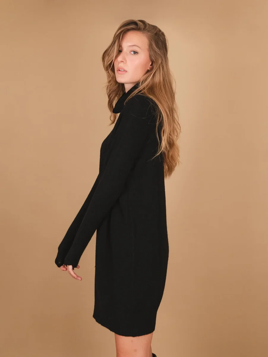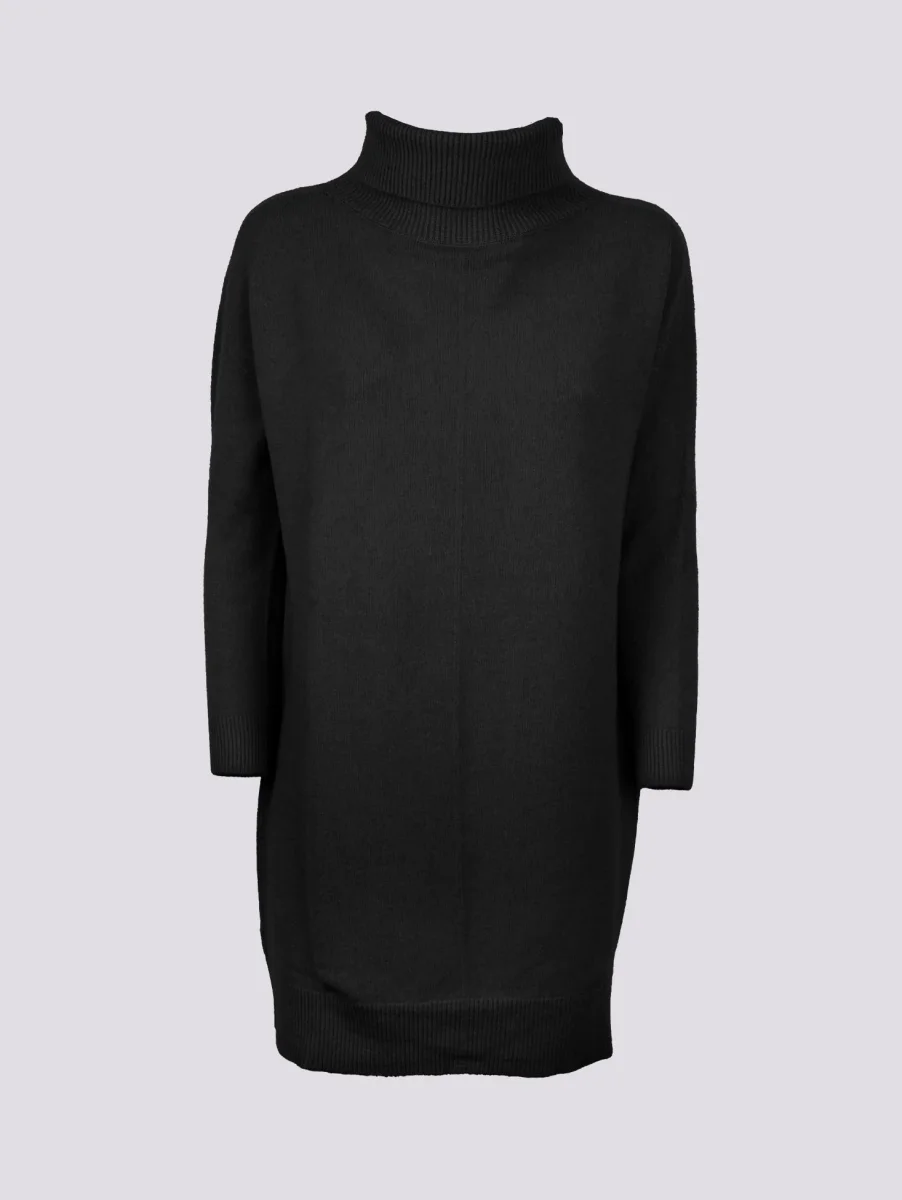 Maglia abito con collo alto nera. Un grande classico da indossare al volo sopra un pantalone skinny quando si ha voglia di vestire comode e sentirsi coccolate da un capo semplice in grado di avvolgere tutte le tipologie di silhouette. Possibilità di indossare il capo come mini abito o come maglia a seconda della statura di chi lo indossa. Peso medio. Composizione: 50% vi, 27% po 23% pl. Vestibilità regolare.