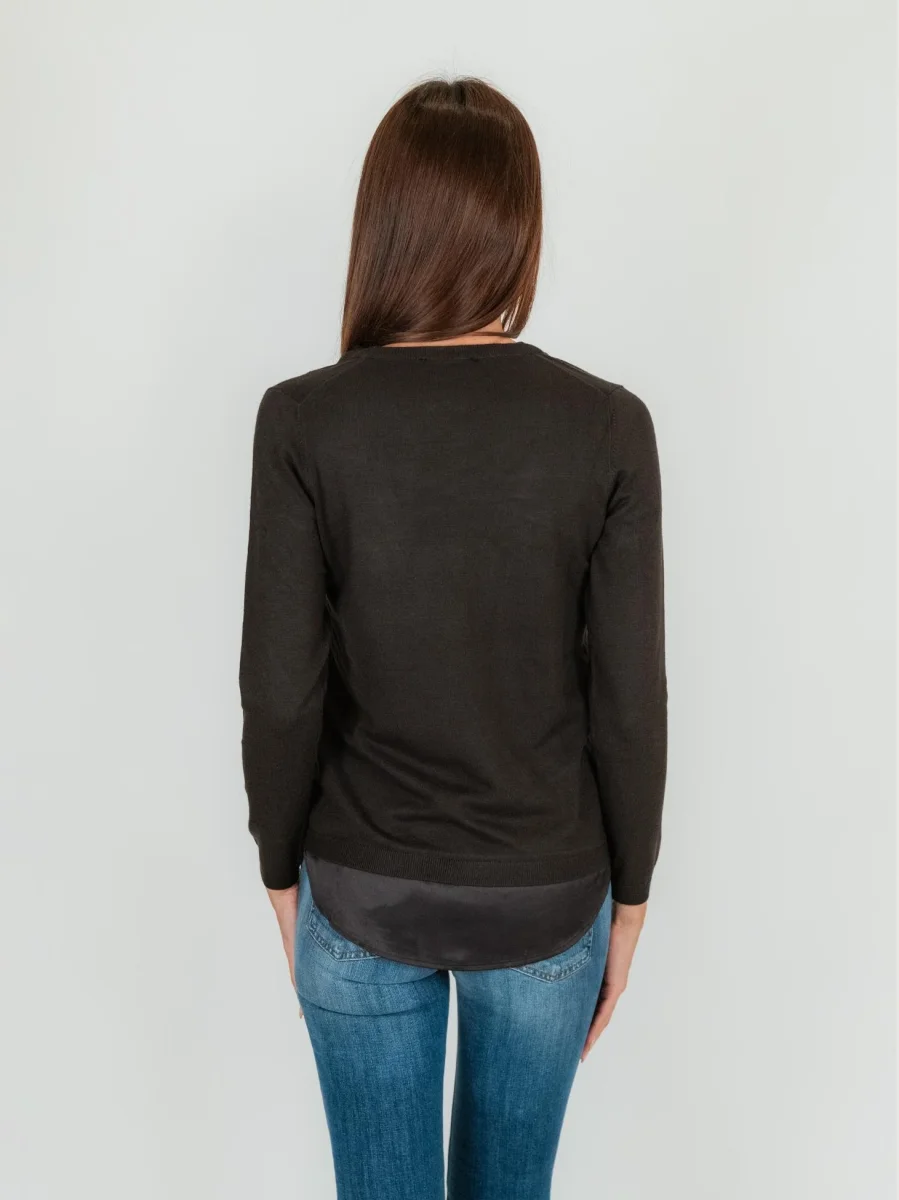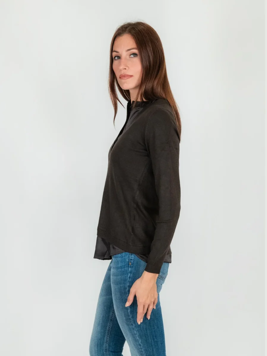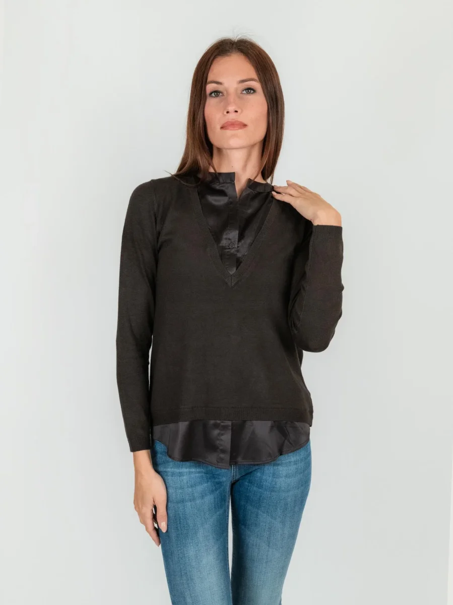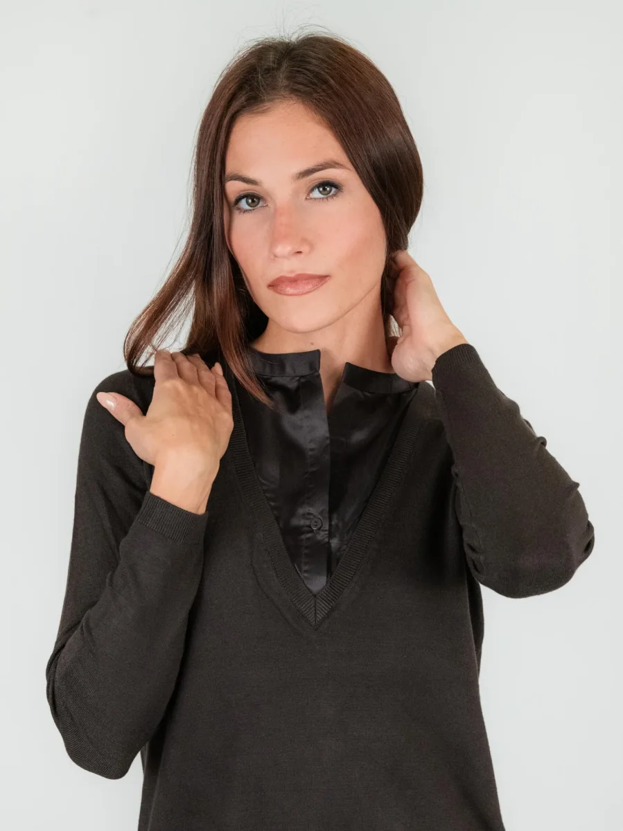 Manica lunga. Parte superiore in maglia, inserto simil camicia in raso in tonalità. Dettaglio bottoni sul collo. Vestibilità regolare. Peso medio. Tessuto morbido elasticizzato.