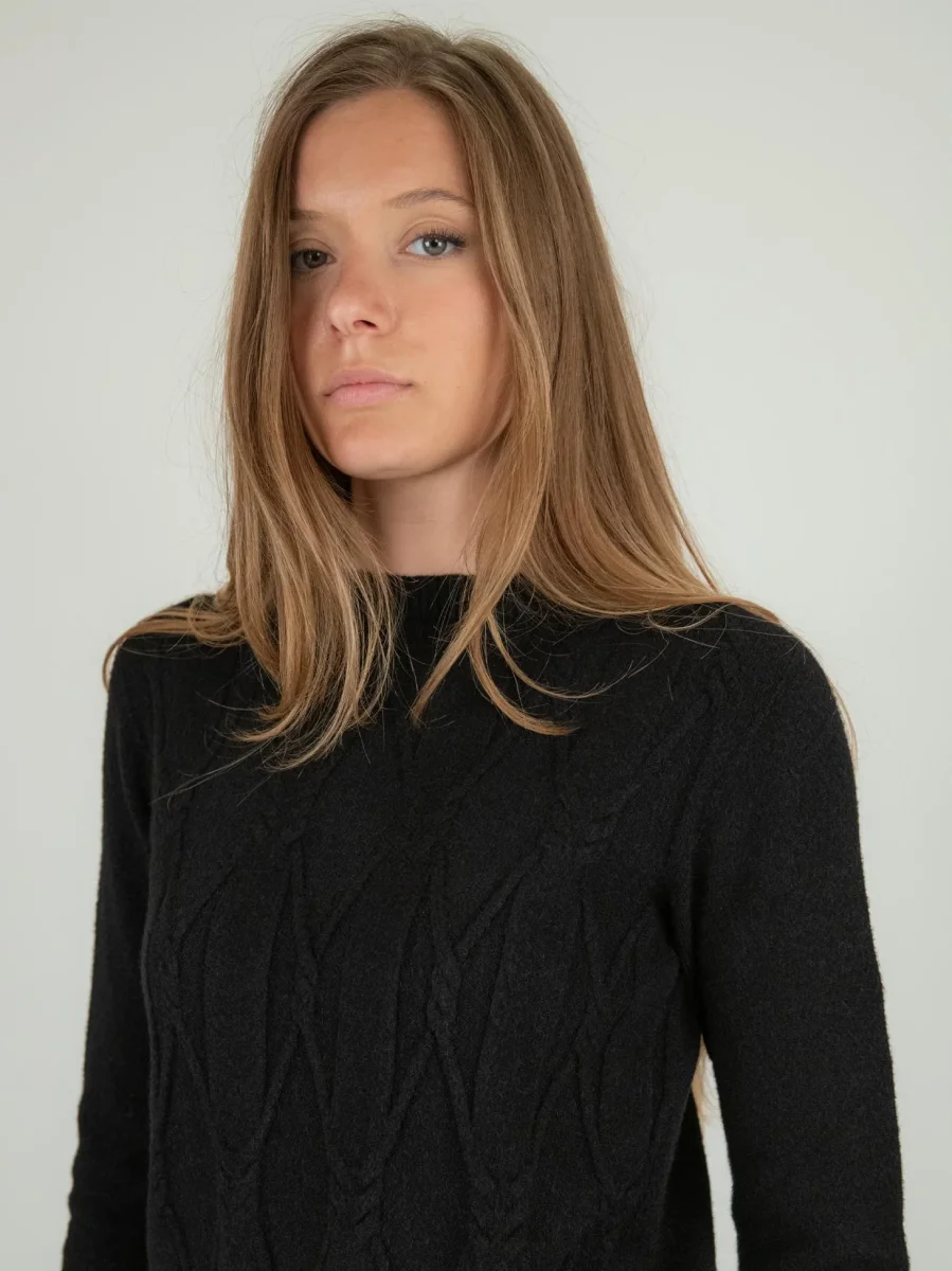 Maglia girocollo nera con lavorazione a intreccio frontale.