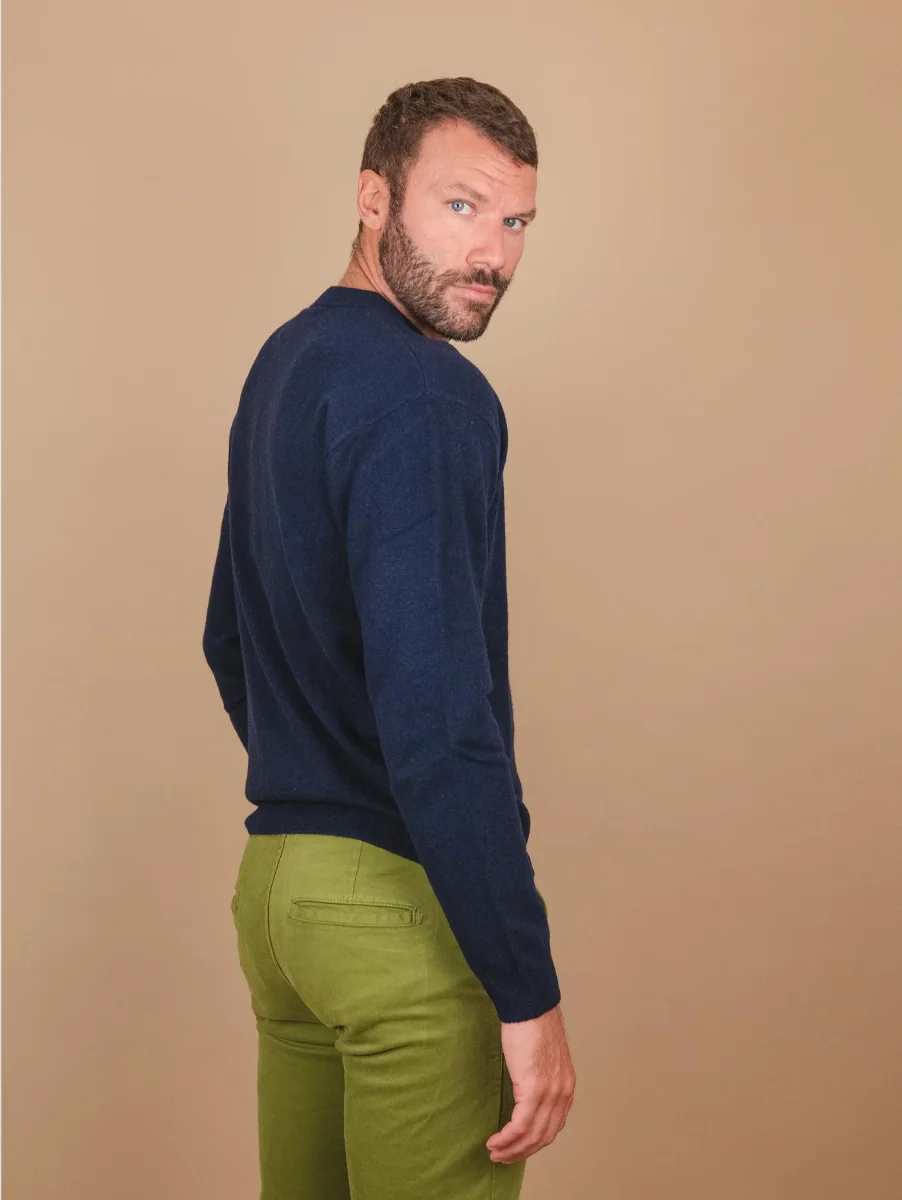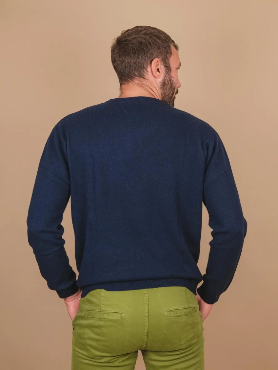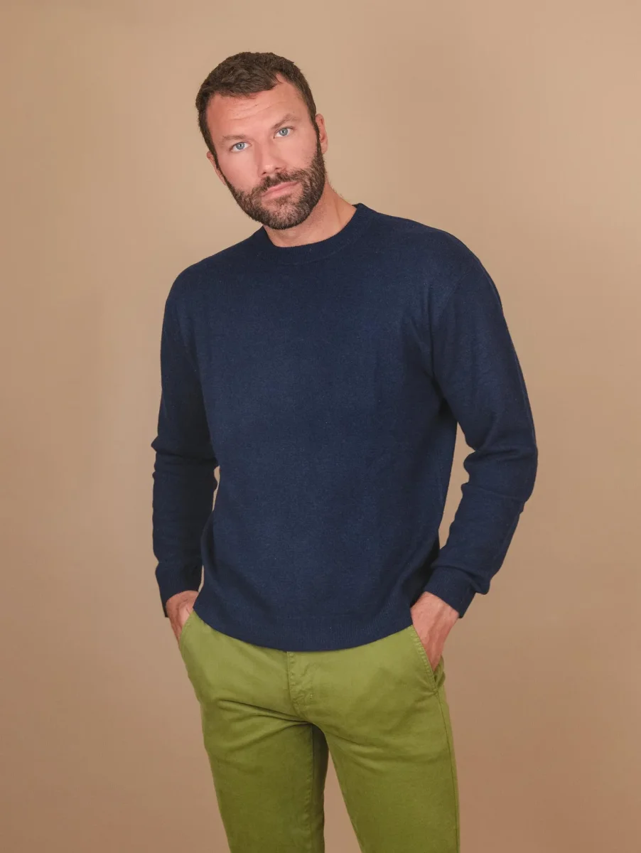 Maglia girocollo in cashmere eco-friendly blu “Trader”. Realizzato con materiali eco friendly e rigenerati, la mission di Absolut Cashmere è impostare tutta la filiera di produzione sulla promessa di lavorare producendo il minore impatto possibile sul nostro pianeta ad esempio seguendo la stagionalità per la tosatura degli animali e altri processi produttivi ecosostenibili. Spalla scesa con manica a pipistrello per una vestibilità più morbida. La maglia presenta sottili coste sulle maniche e su tutto il collo. Peso medio. Vestibilità regolare. Composizione 100% cashmere.