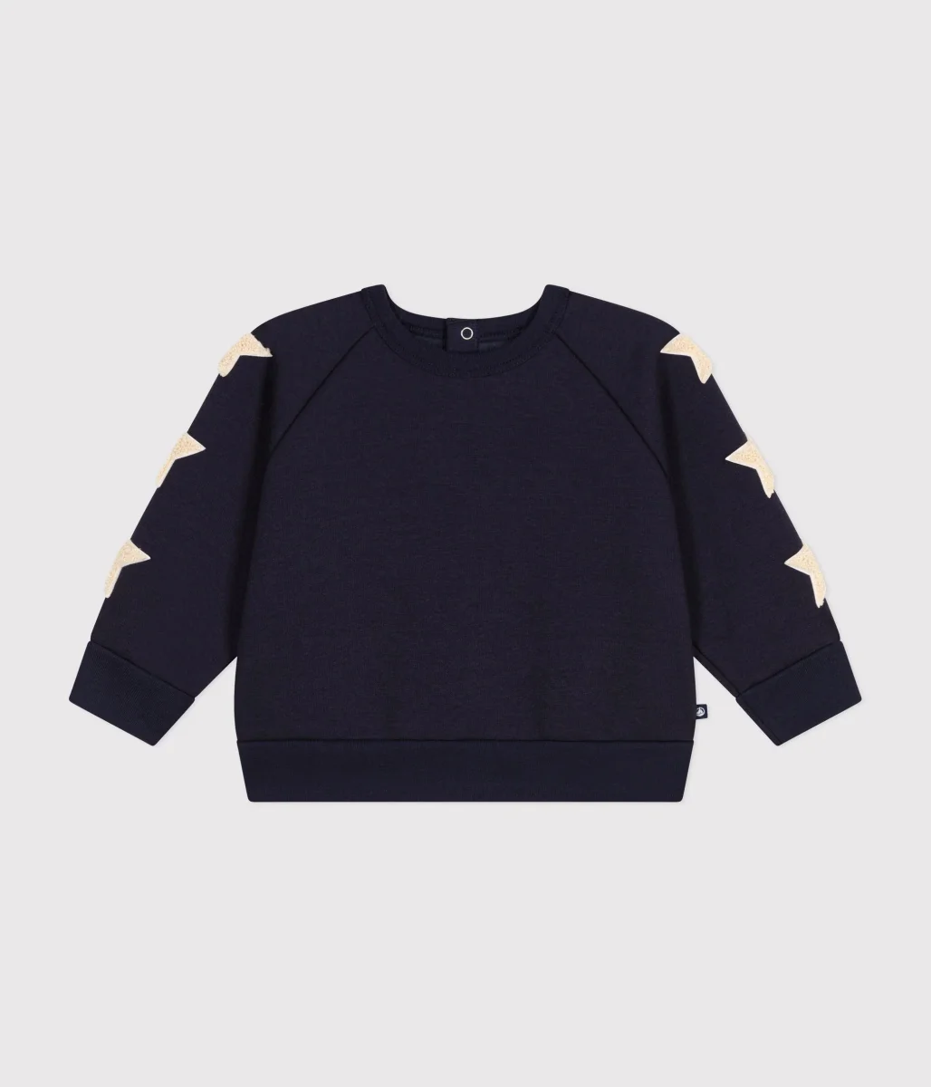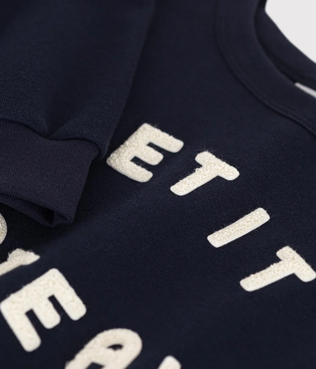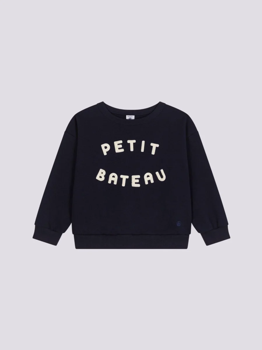 Scritta “Petit Bateau” con gioco di bouclette per un look moderno.