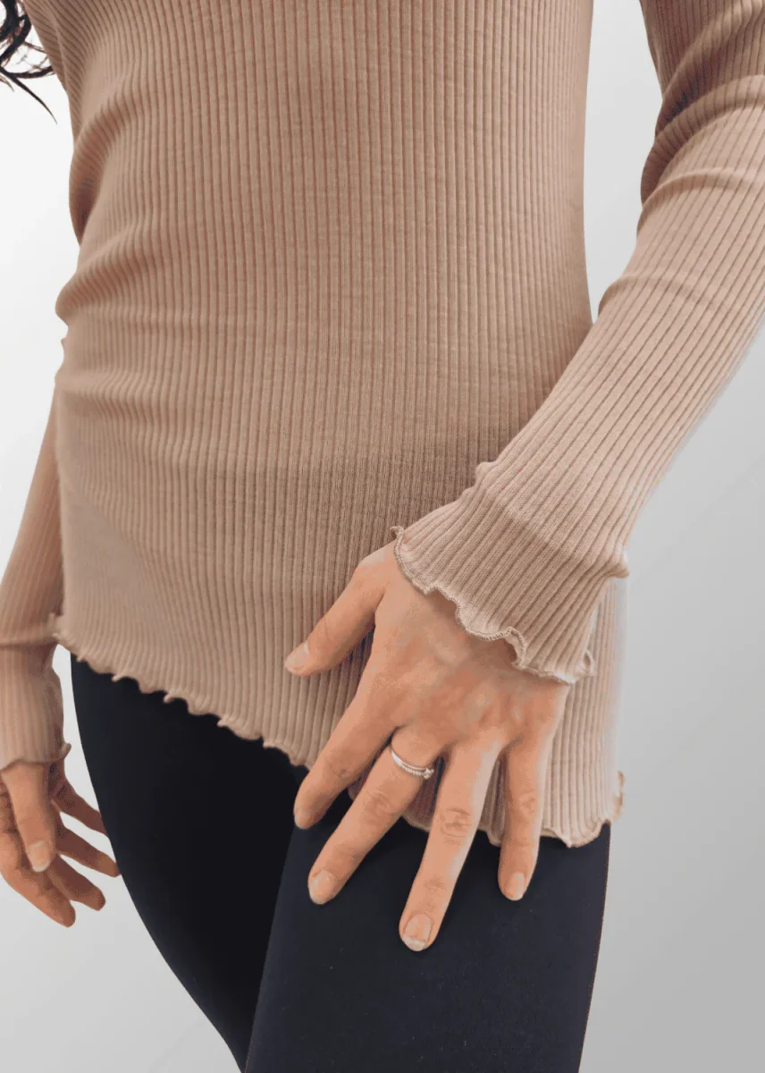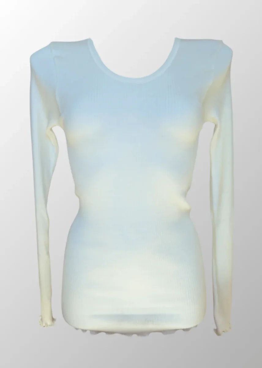 Maglia a manica lunga da donna con bordini frastagliati, realizzata in pura lana vergine. La trama a costine senza cuciture laterali è molto elastica e si adatta perfettamente alla forma del corpo quando indossata. Ideale per il periodo invernale poiché garantisce sempre calore, morbidezza e comfort.