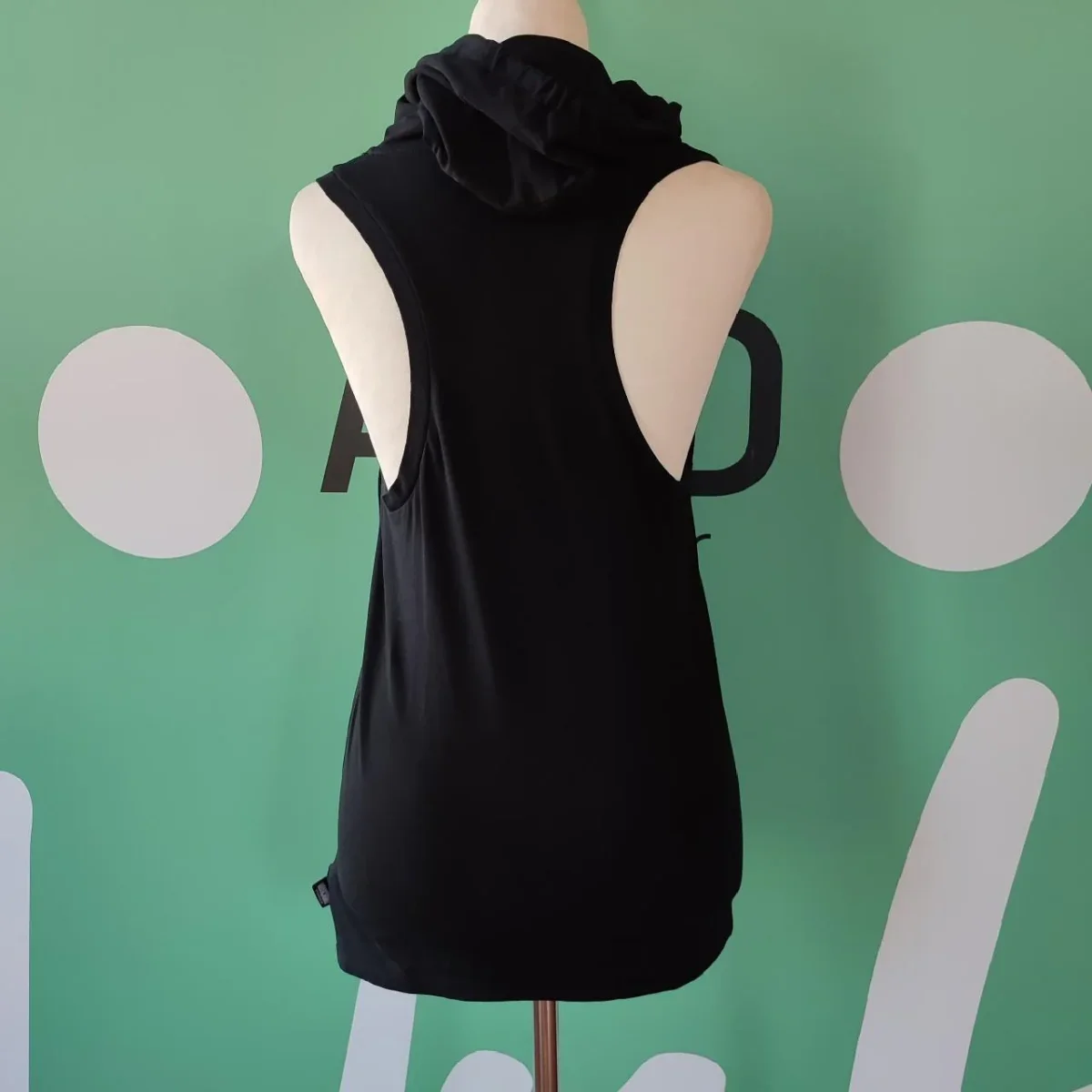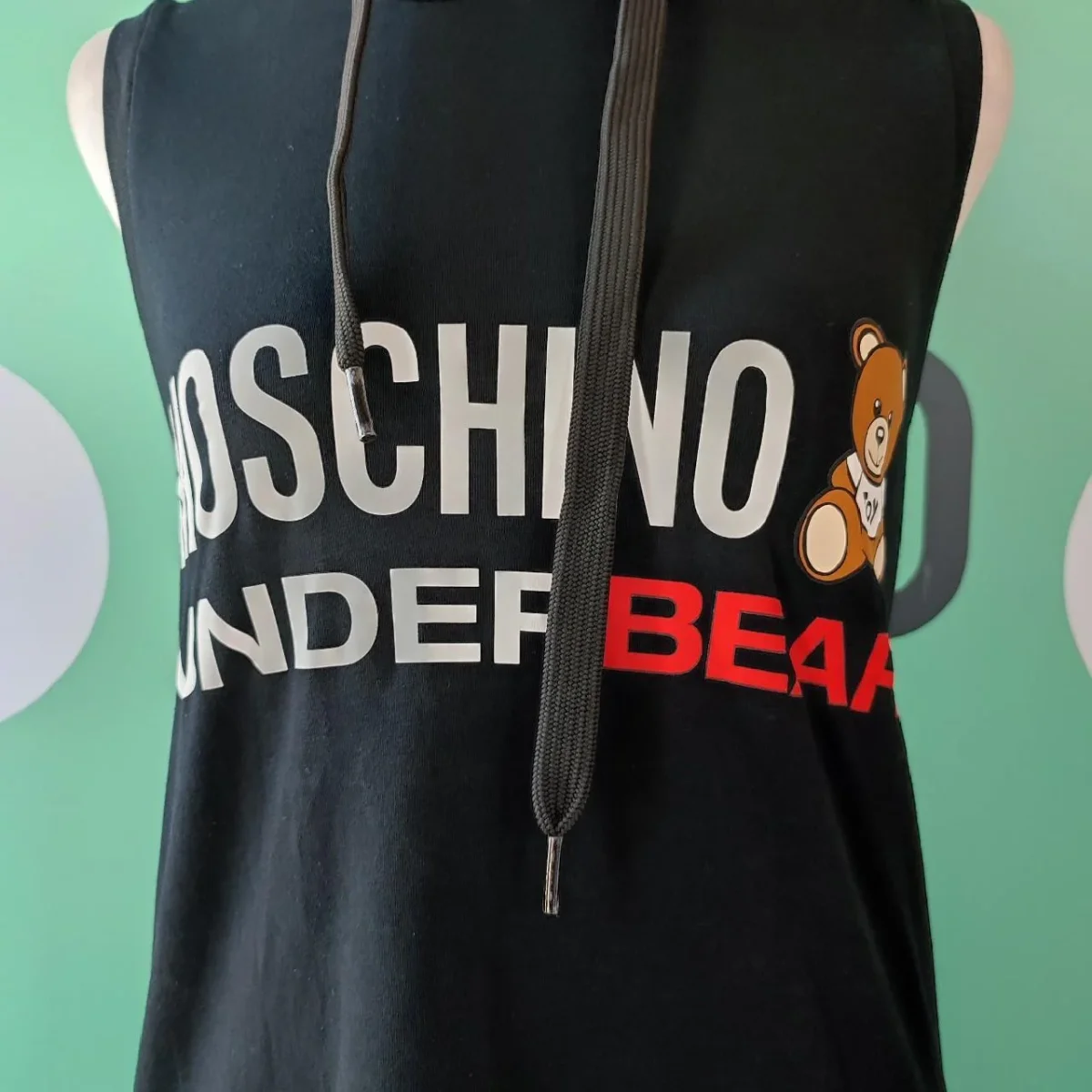 Maglia smanicata modello olimpico con cappuccio. Marca Moschino. Tg. M. 92% Cotone 8% Elastan. Colore Nero con serigrafia frontale che riporta il nome del Brand in Bianco e Rosso con il simpatico Orsetto nelle tonalità del Beige. Sul fondo del lato sinistro è cucita l’etichetta che riporta il nome della Maison. Il cappuccio è completo di coulisse e sul fronte la scollatura è una piccola V. Leggere stonalizzature di colore sul fronte, che non ne pregiudicano assolutamente la bellezza. Buone condizioni.