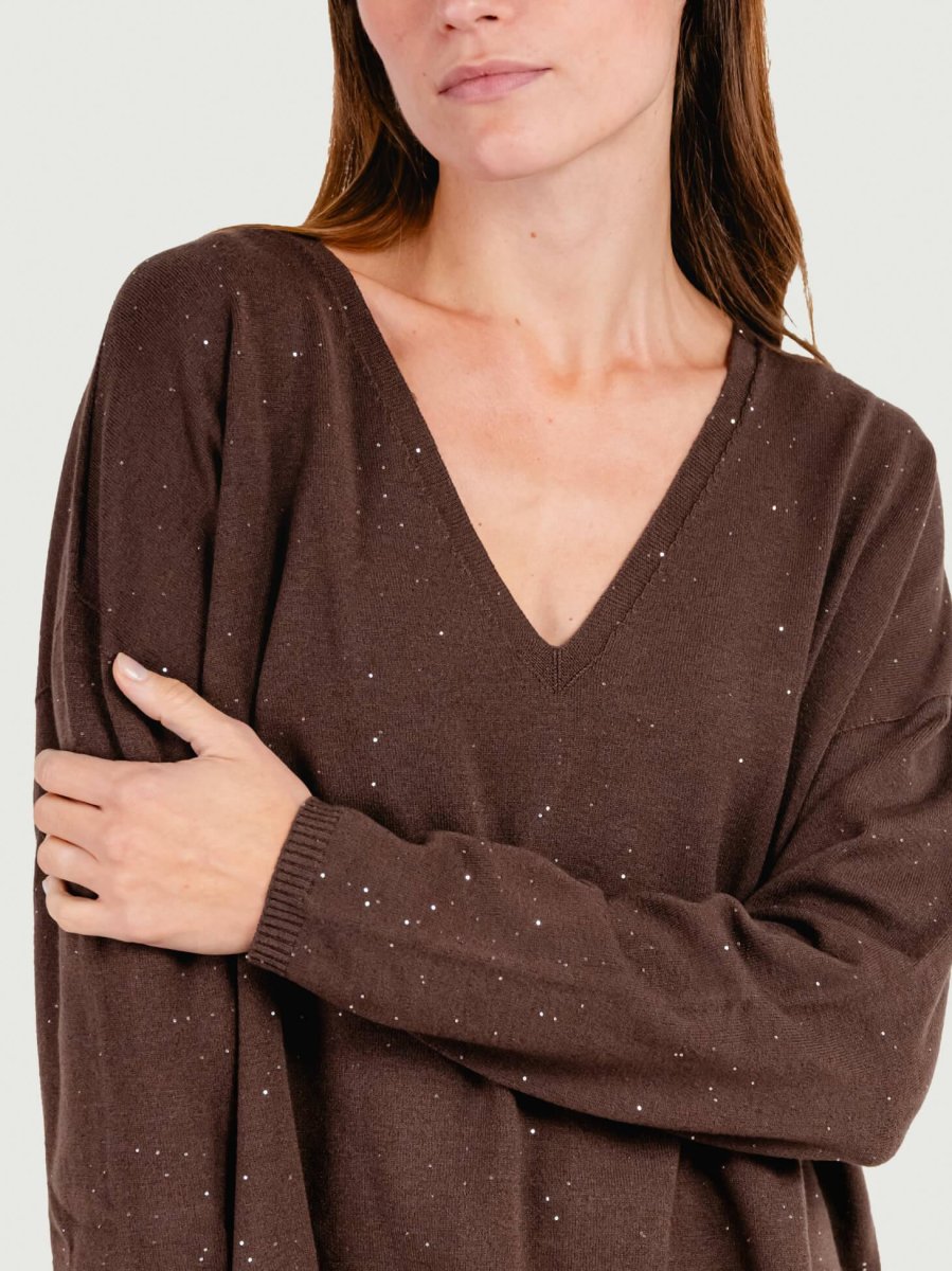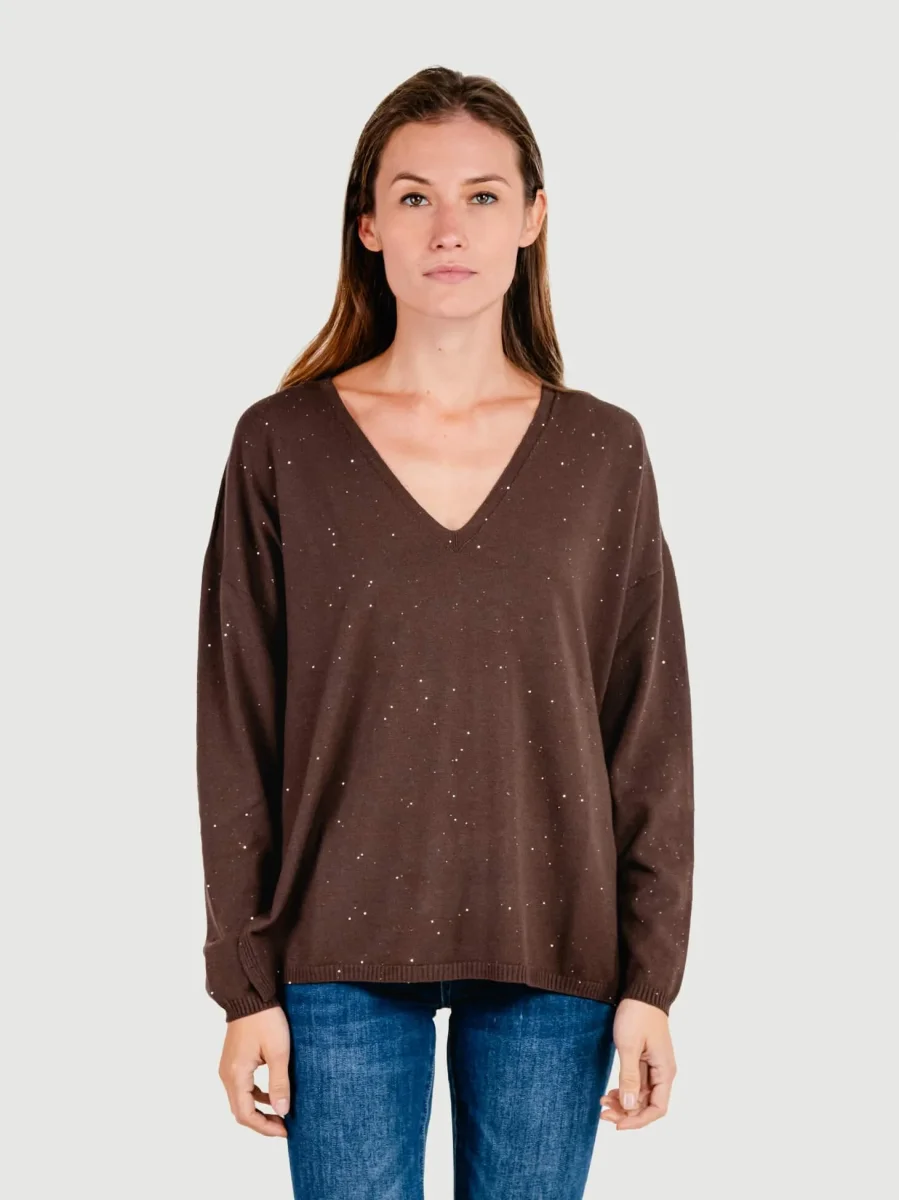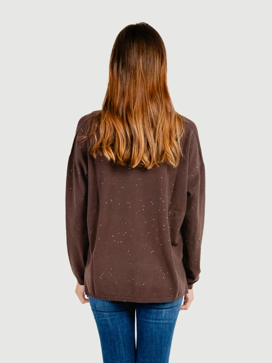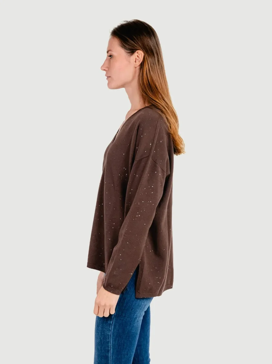 MAGLIA OVER A V MARRONE CON STRASS