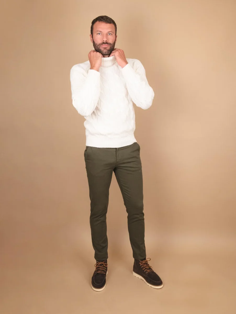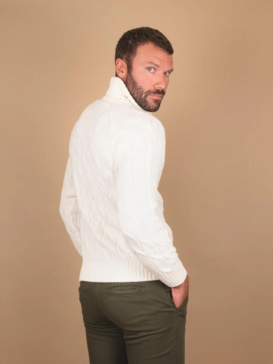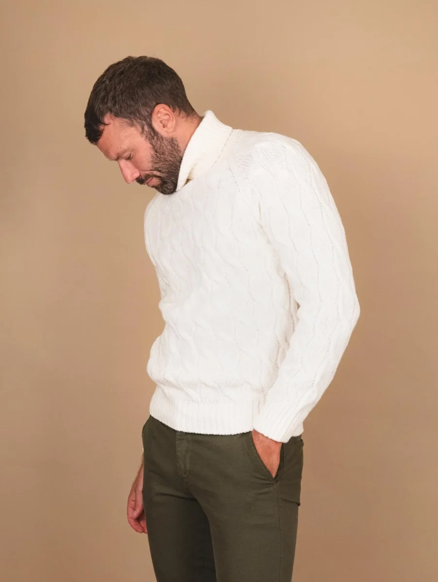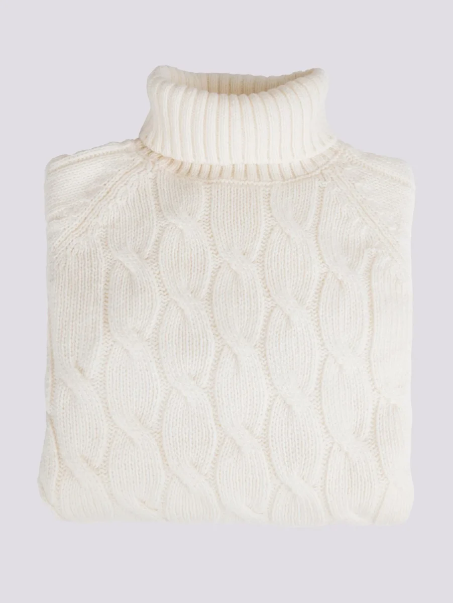Maglione a collo alto in 100% lana vergine bianca con maxi intreccio e profili a coste.