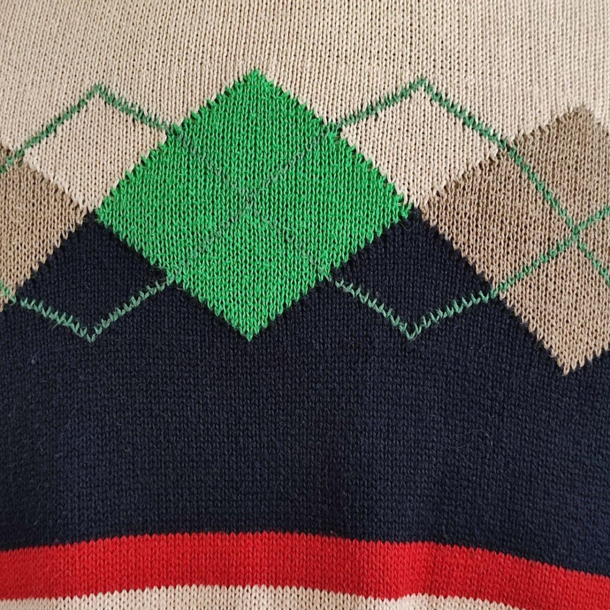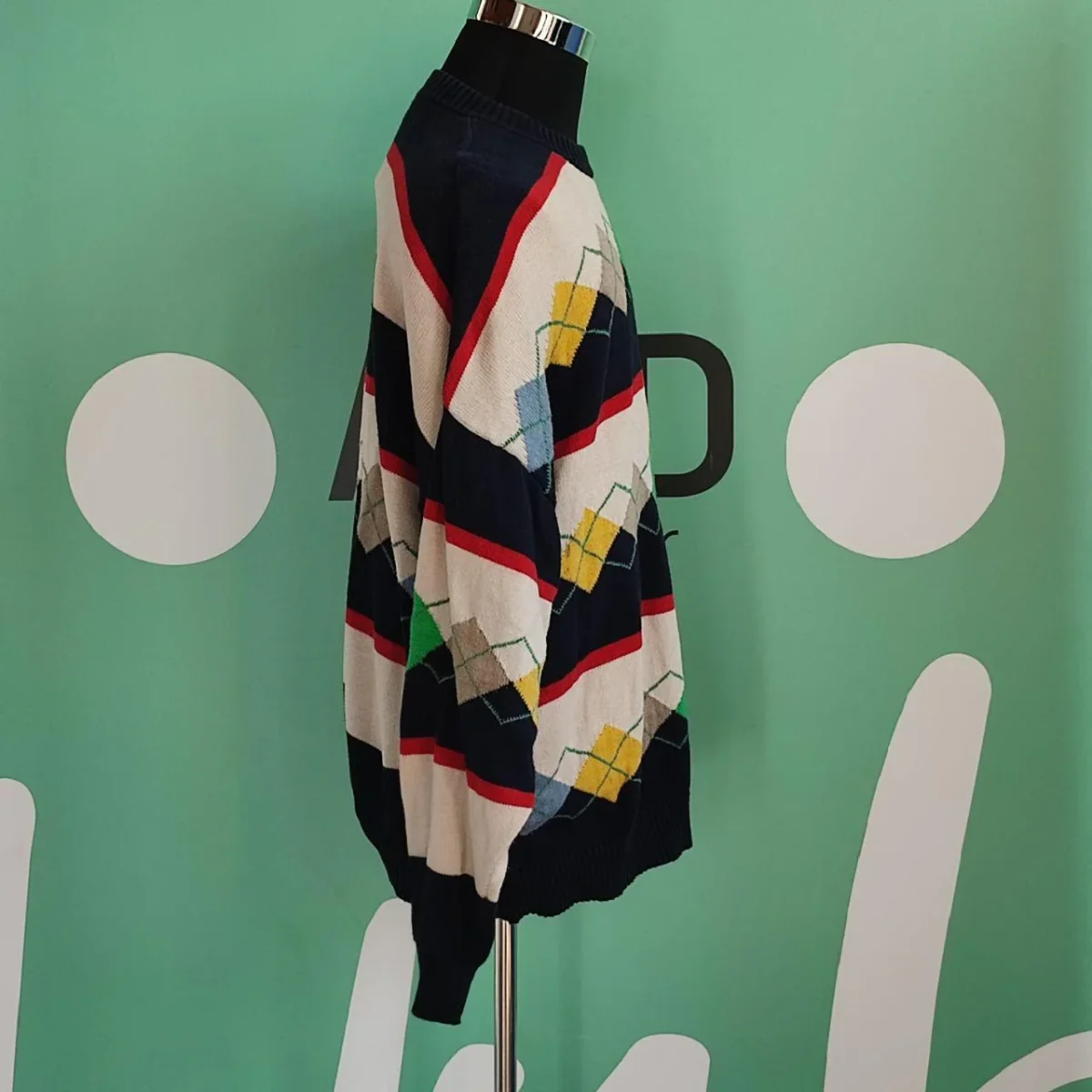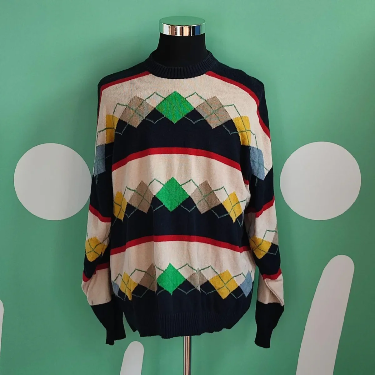 Maglione da uomo, taglia L, marca Stefanel. Il capo è in ottime condizioni, senza dei particolari difetti. La trama della grafica è a righe colorate di bianco e di blu scuro, che si intrecciano con dei rombi di vari colori. Sui polsini, sul colletto e nell’orlo finale del maglione il tessuto è leggermente elasticizzato. La composizione del tessuto non è presente, ma al tatto si direbbe cotone, il capo è comunque pesante ed ideale per le stagioni fredde. Il capo è Made in Italy.