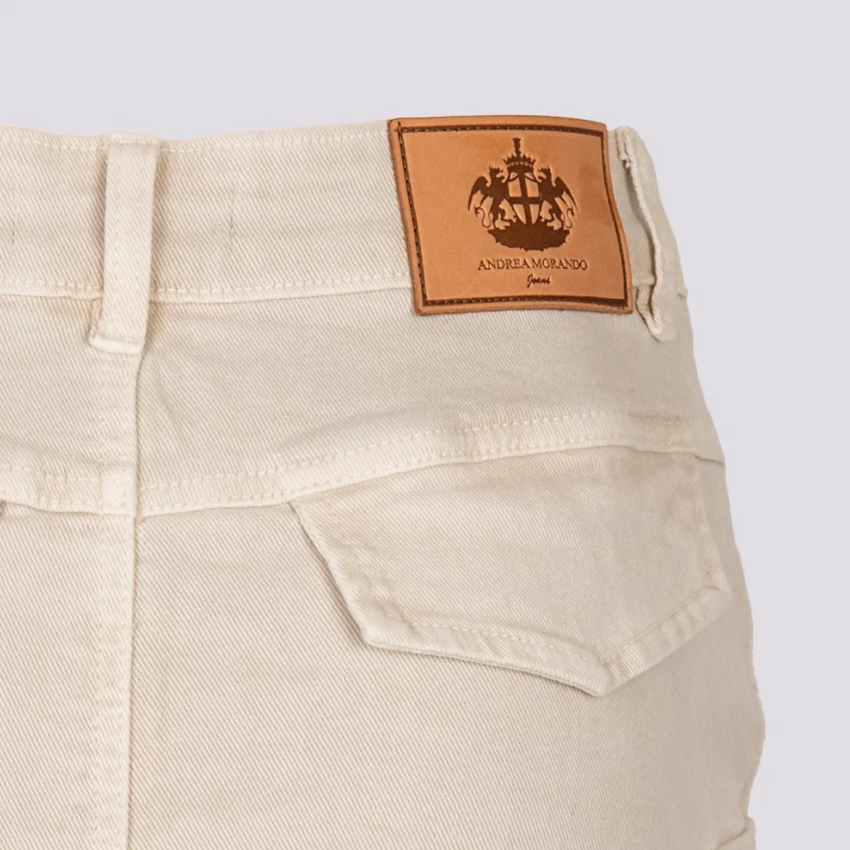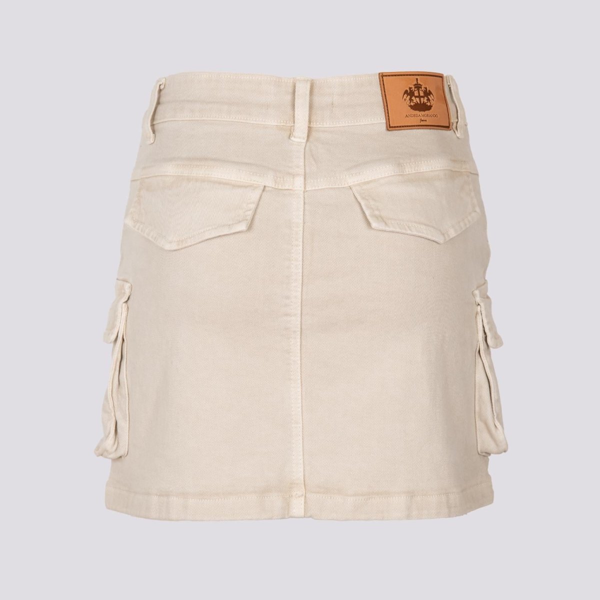 Mini gonna cargo in cotone panna. Un capo cool e femminile allo stesso tempo perfetto per essere sfruttato tutto l’autunno. Maxi tasche applicate su entrambi i fianchi. Cinque tasche. Chiusura bottone in metallo frontale. Dettaglio salpa con logo Andrea Morando e stemma di genova. Tessuto leggermente elasticizzato. Cuciture in rilievo a vista in tonalità. Peso medio. Vestibilità regolare.