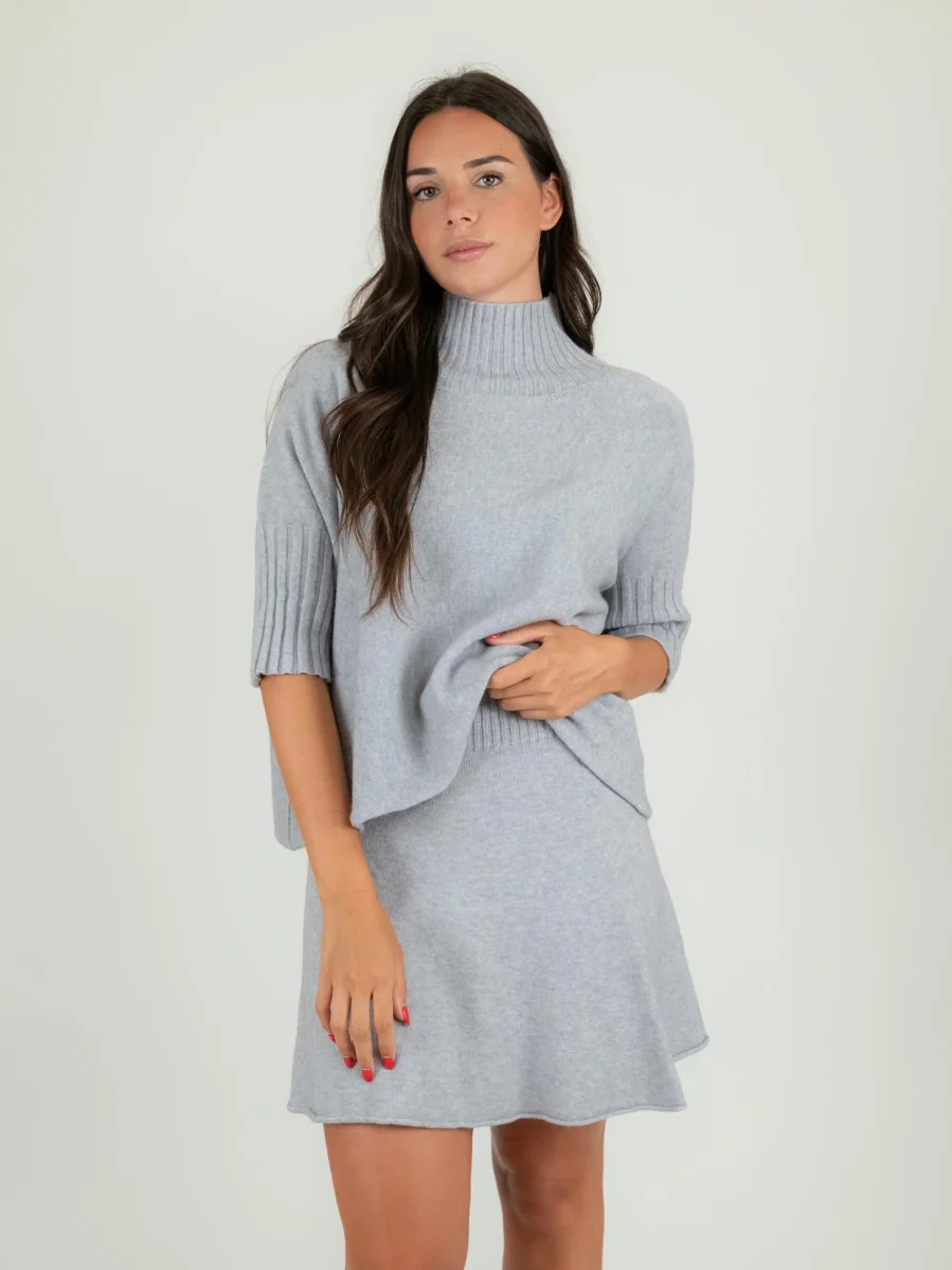 Mini gonna svasata in maglia grigio perla con elastico in vita.