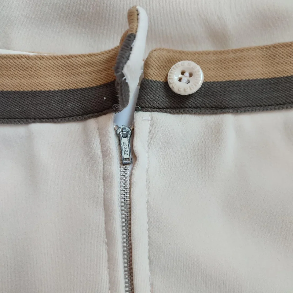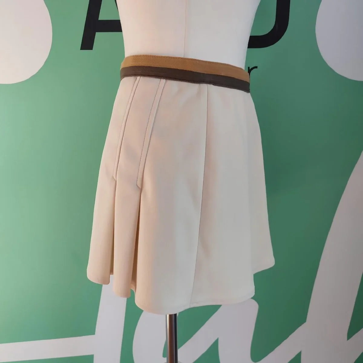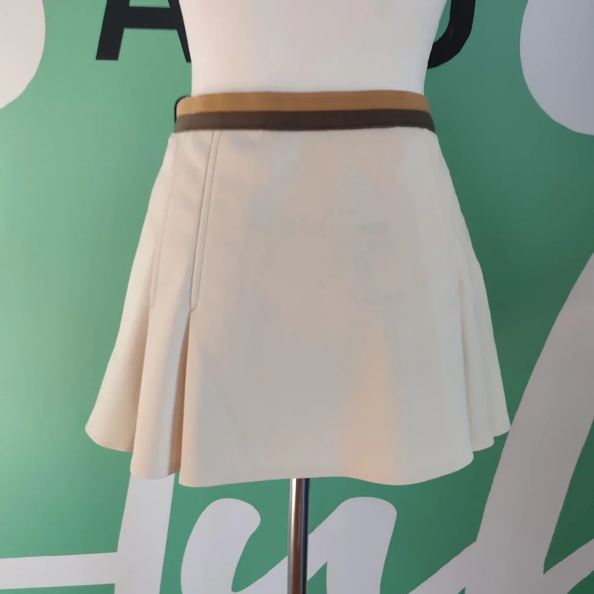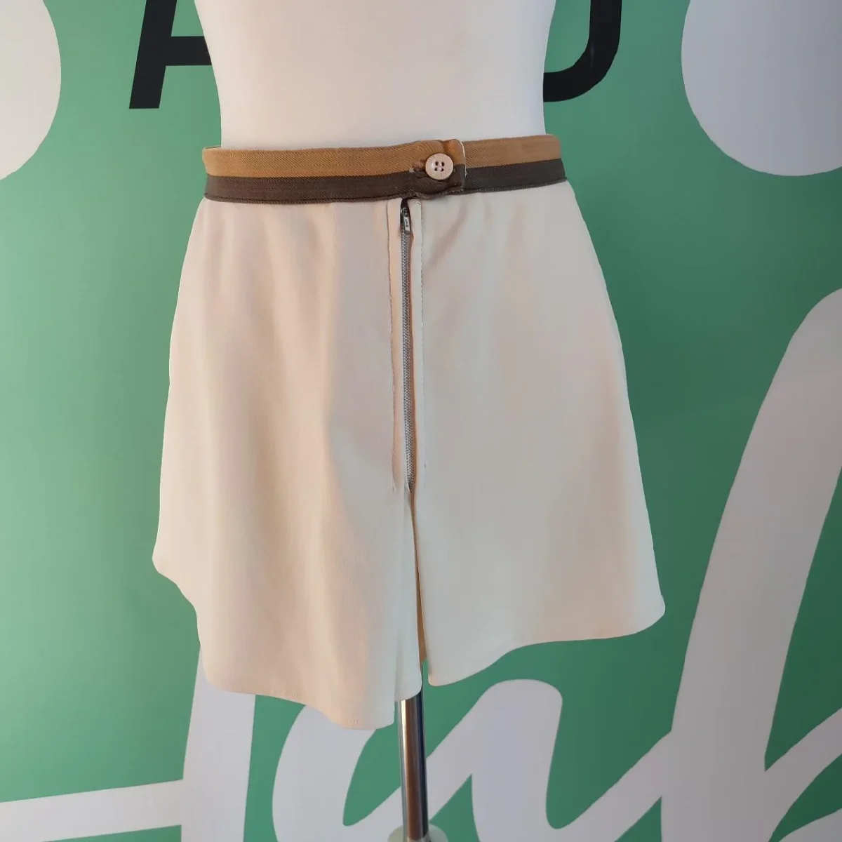 Minigonna Benning, tg S, color panna con fascia in vita sui toni del marrone. Chiusura laterale a zip e bottone, gonna con pieghe. In poliestere, condizioni ottime.