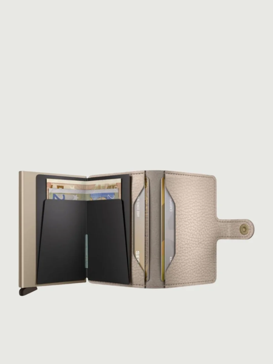 Piccolo nelle dimensioni ma sorprendentemente capiente: il Miniwallet soddisfa tutte le esigenze. Il rivestimento esterno può contenere banconote, scontrini e tessere, mentre il Cardprotector in alluminio consente di estrarre le carte con un semplice movimento, impedendo che si pieghino, si spezzino o che vengano lette senza che ce ne accorgiamo.