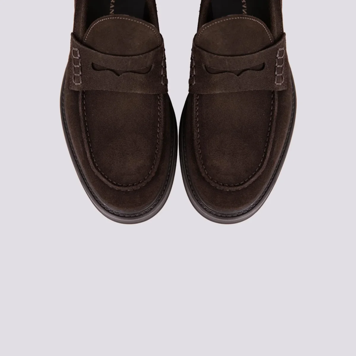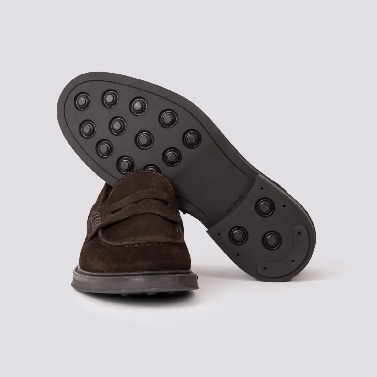 Mocassino in camoscio marrone con penny in tonalitá. Punta stondata Dettaglio cuciture in rilievo in tonalita. Calzata leggermente abbondante. Tomaia e fodera in vera pelle. Suola in gomma.