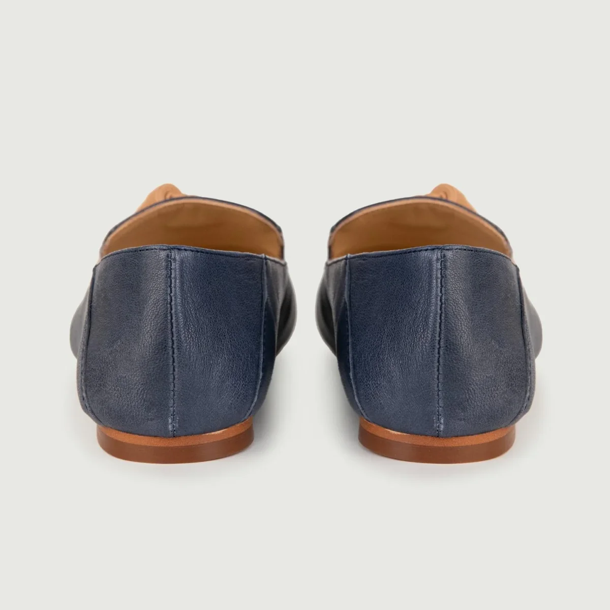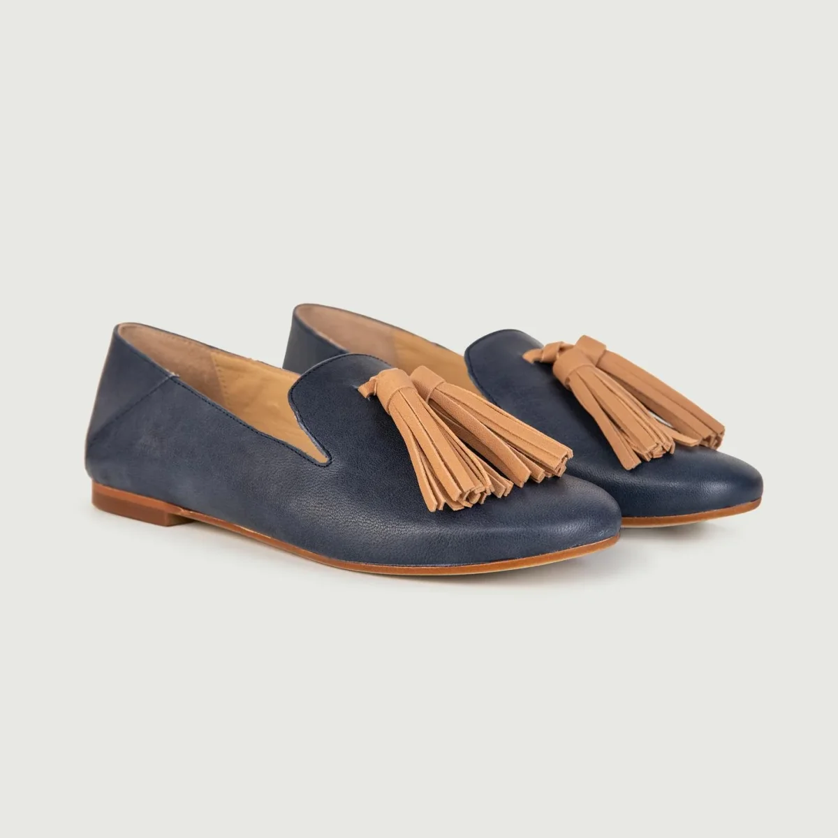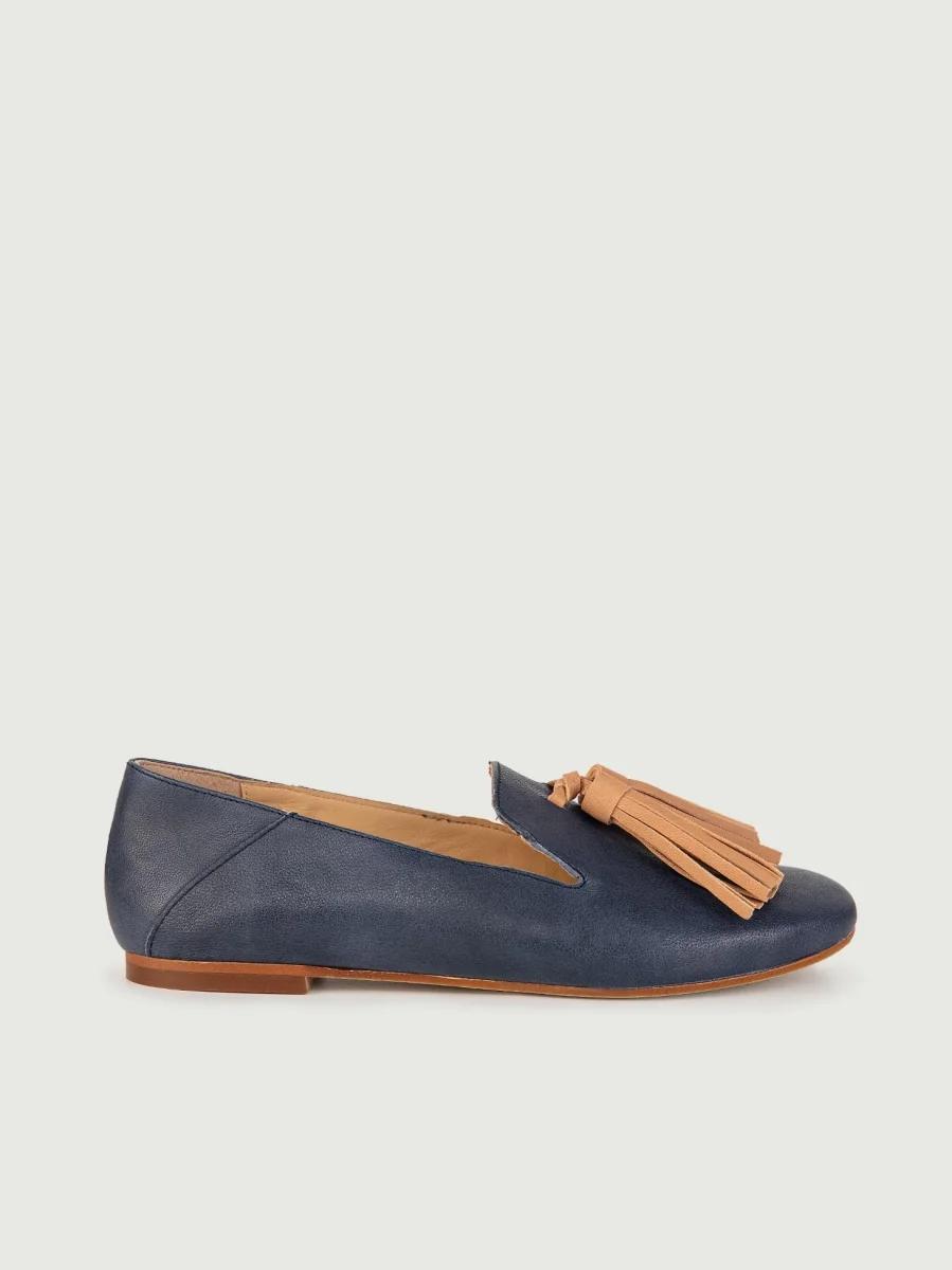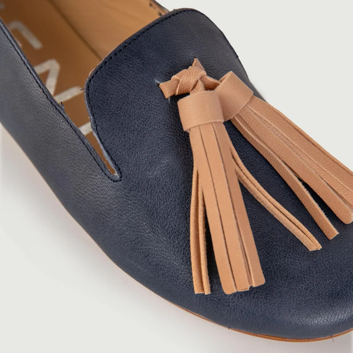 Mocassino in nappa color blu con applicazione maxi nappina frontale a contrasto.