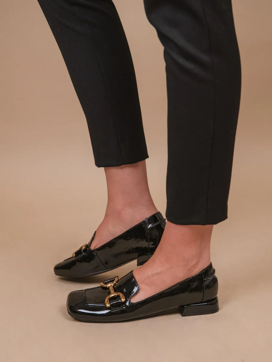 Mocassino in vernice nera con morsetto, caratterizzato da una punta squadrata.