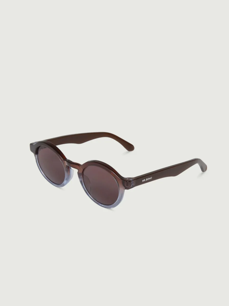 Montatura con design bicolor: parte superiore tartarugato marrone parte inferiore azzurro in trasparenza
