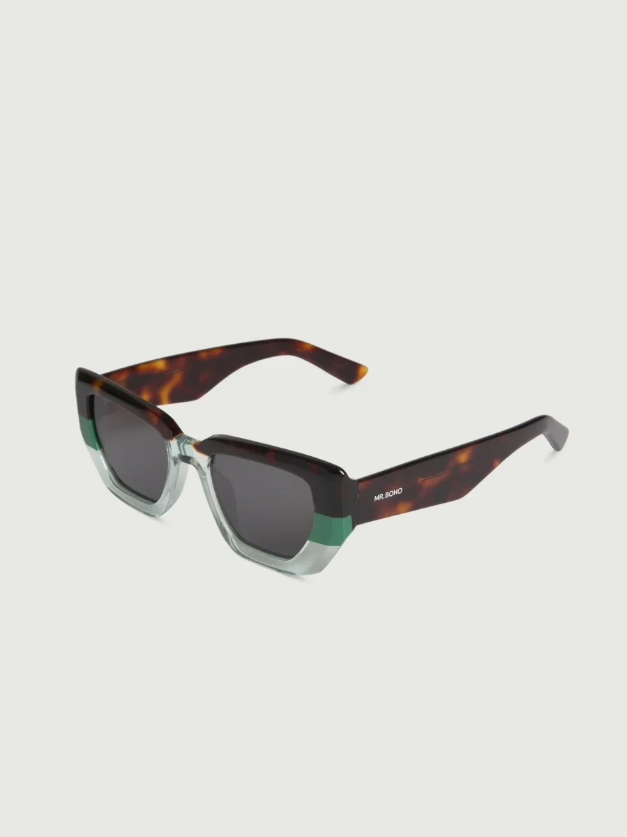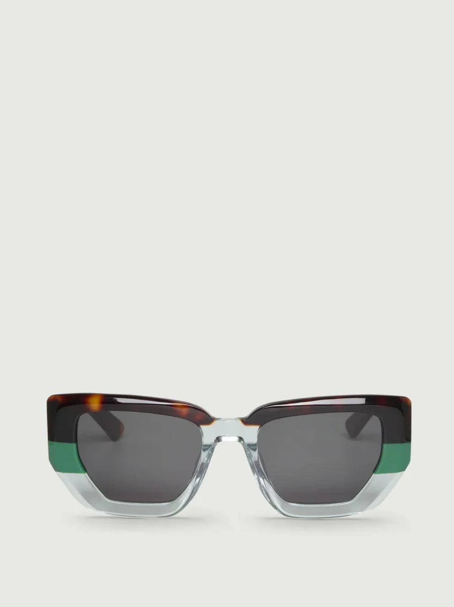 Montatura con design tricolor: parte superiore tartarugata, parte centrale verde e parte inferiore grigio in trasparenza.