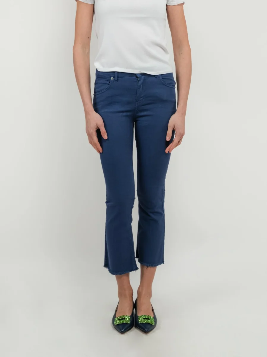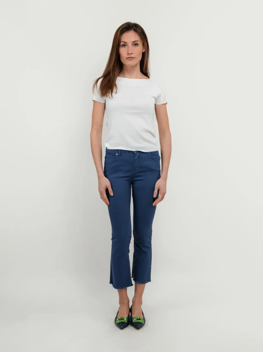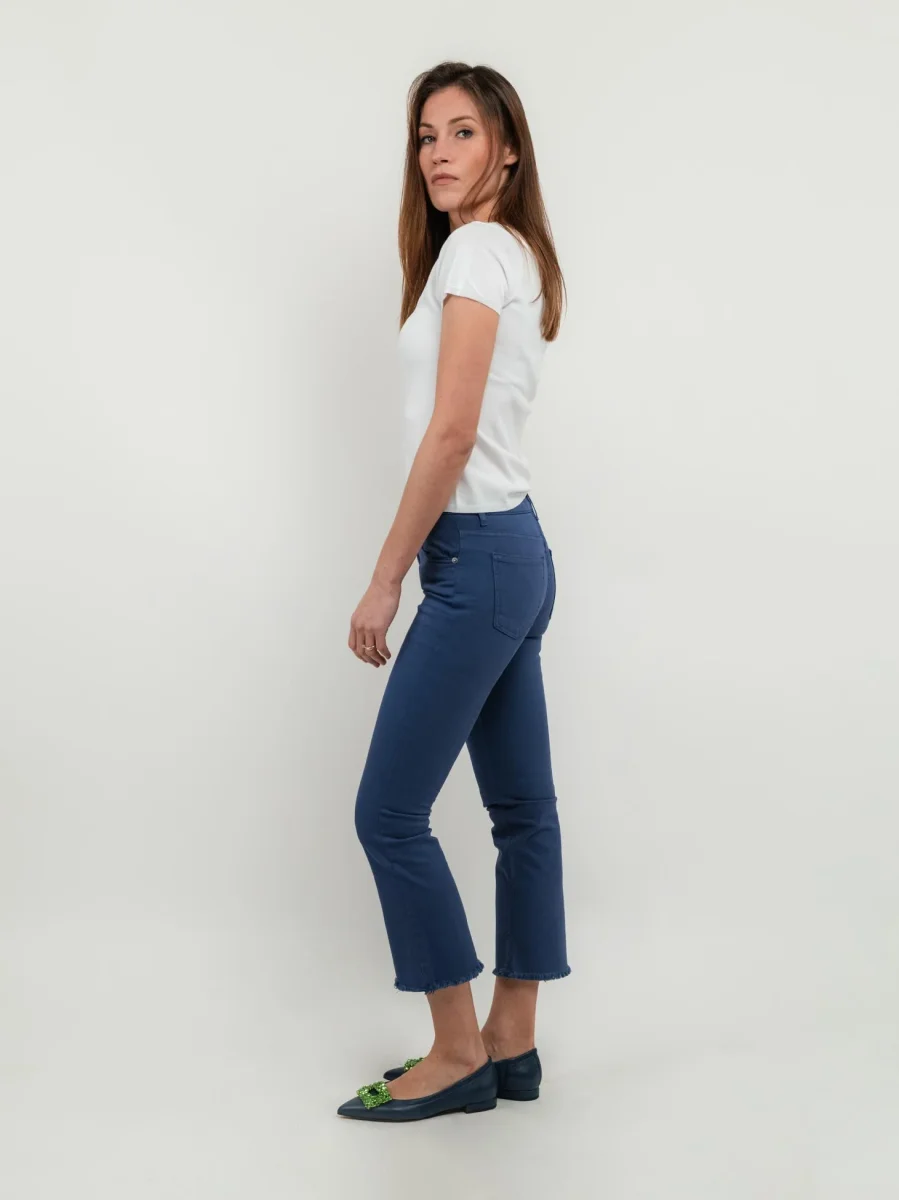 Pantalone 3 tasche a zampa in cotone blu.