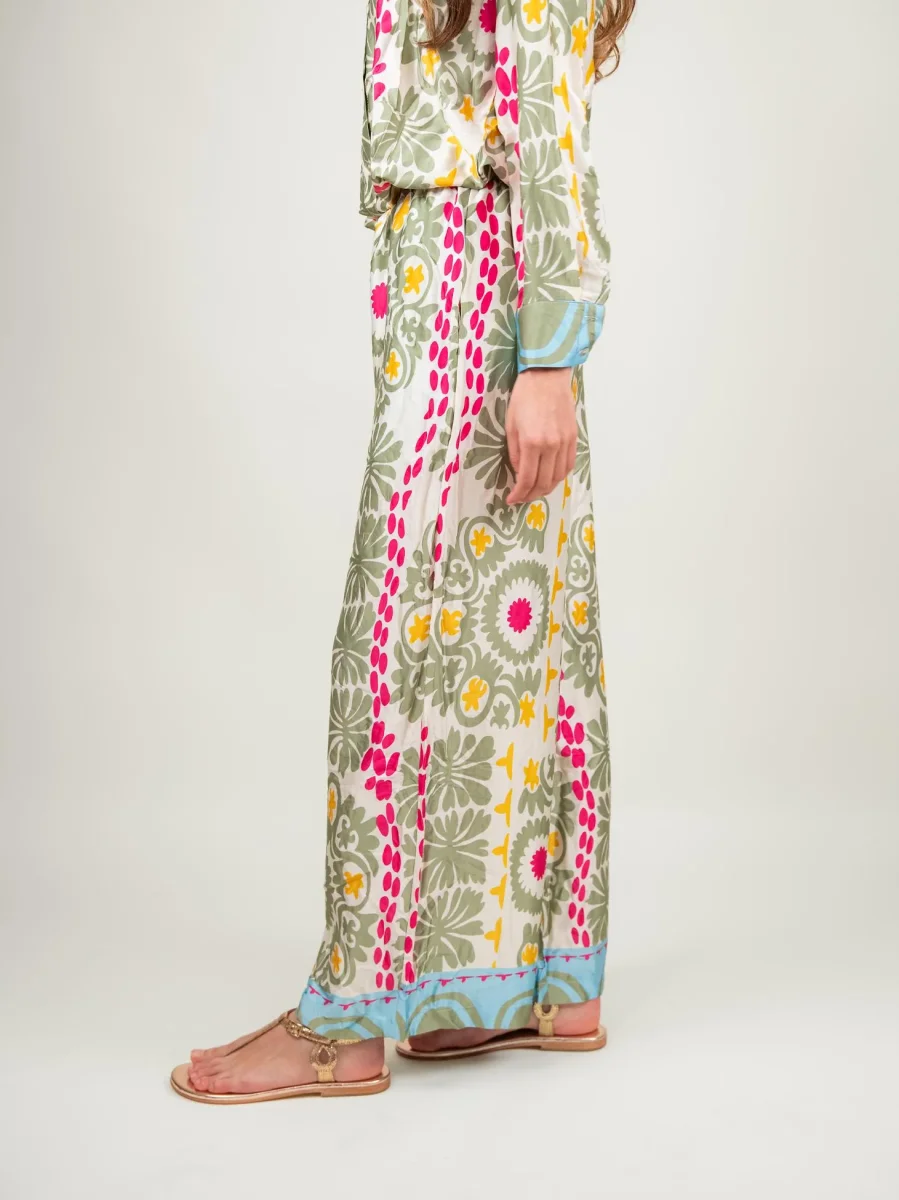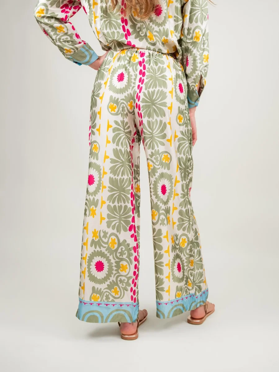 Pantalone a palazzo in fantasia multicolor salvia, giallo e rosa.
