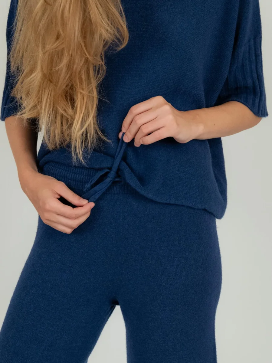 Pantalone a palazzo in maglia blu con coulisse e dettaglio a costine in vita.