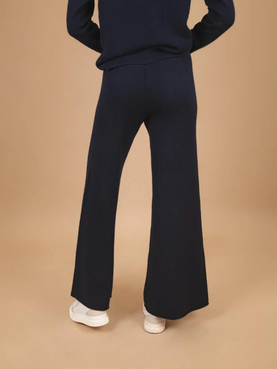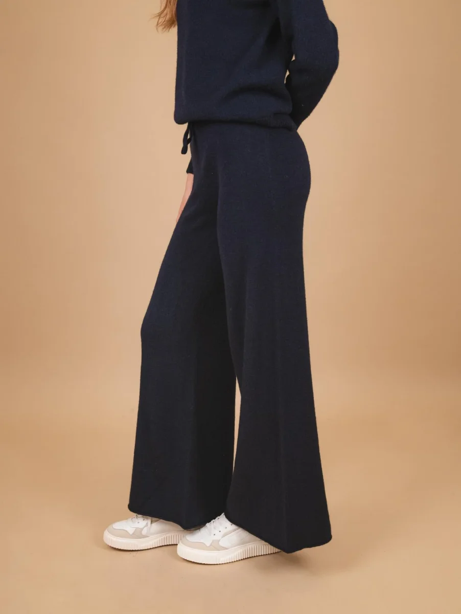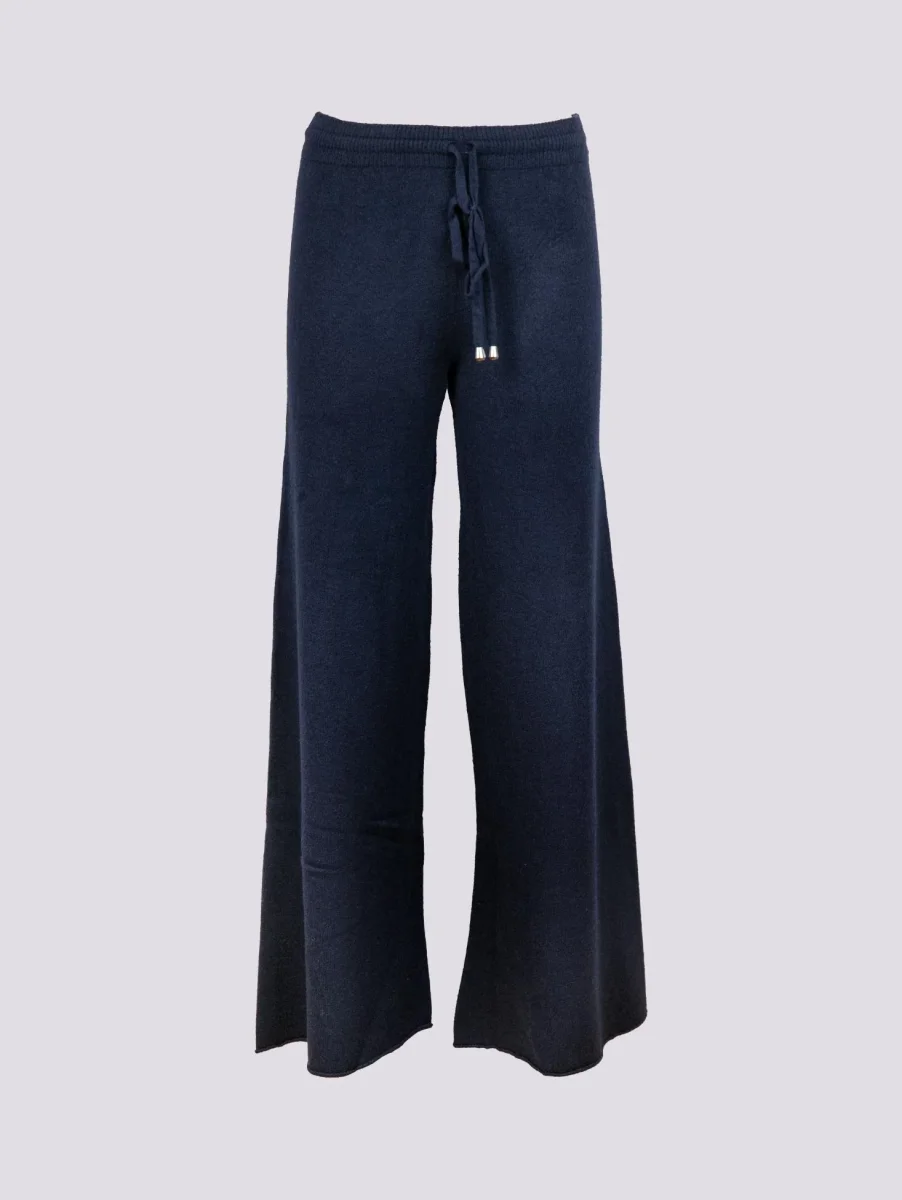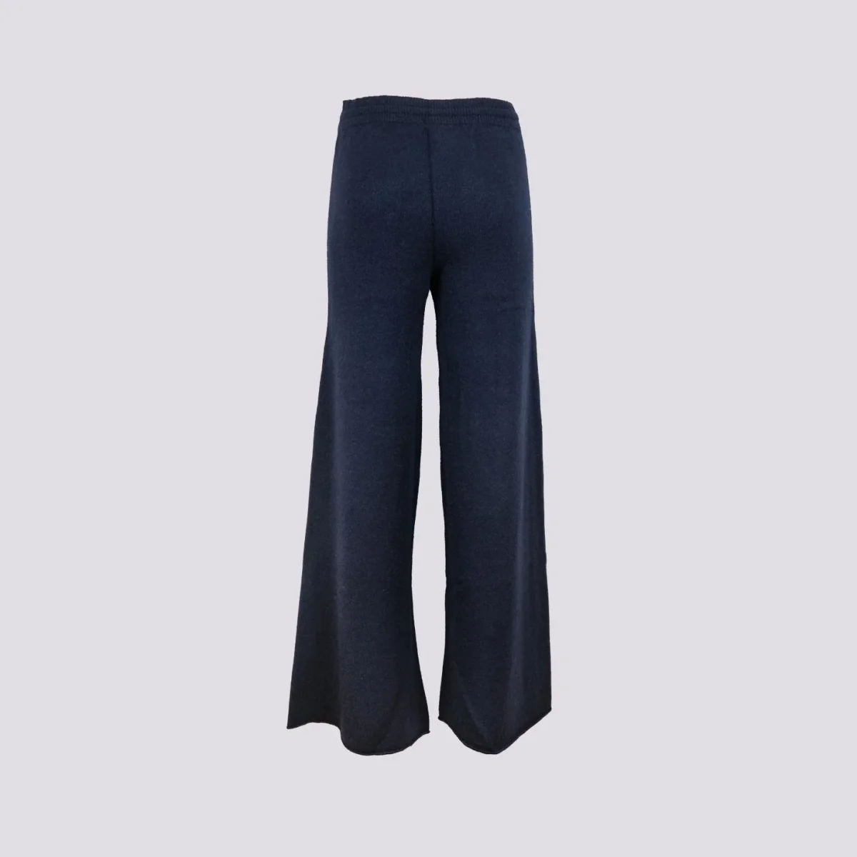 Pantalone a palazzo blu in maglia elasticizzato. Cordino in vita regolabile a seconda delle preferenze. Questo capo è stato pensato per essere portato in abbinamento a una delle maglie della Capsule per un look comfort tinta unita perfetto da indossare tutti i giorni e – soprattutto – ogni volta che si viaggia. Peso medio. Composizione: 50% vi, 27% po 23% pl. Vestibilità morbida.