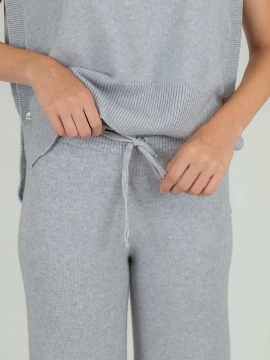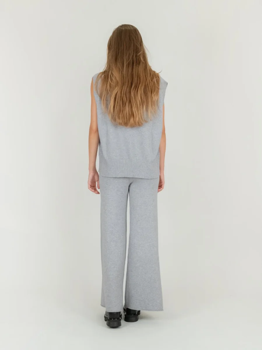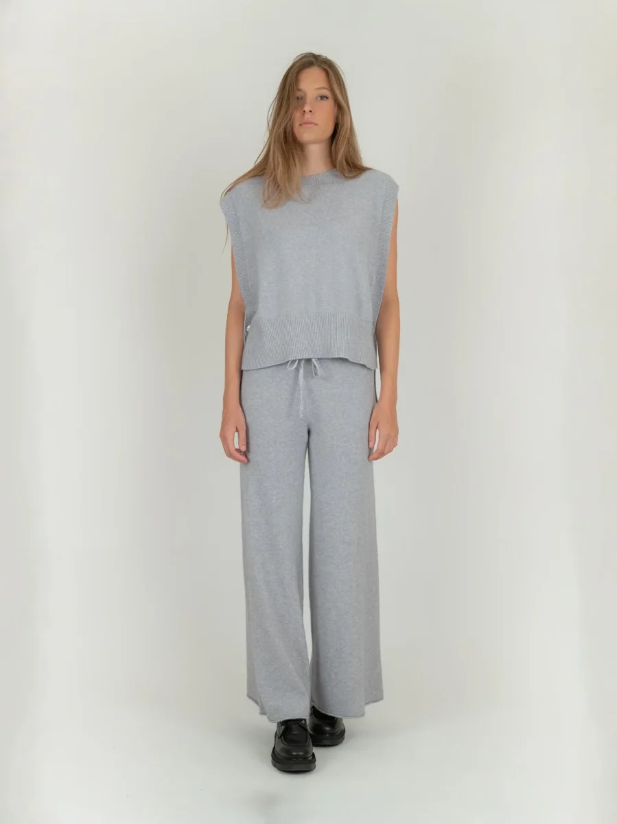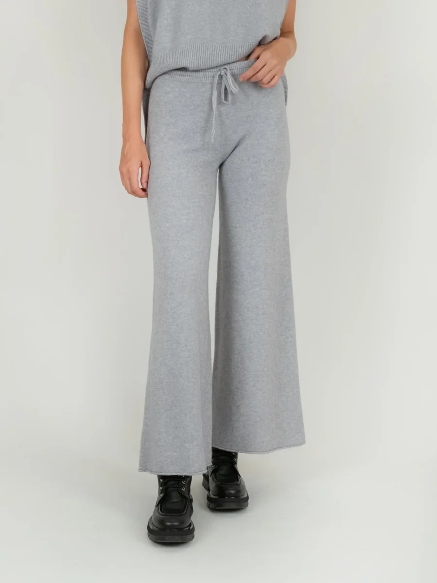 Pantalone a palazzo in maglia grigio perla con coulisse e dettaglio a costine in vita.