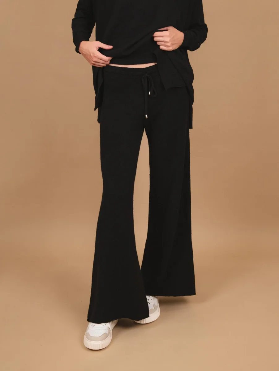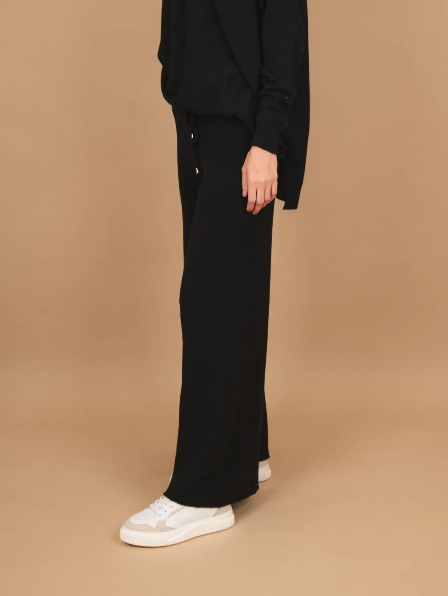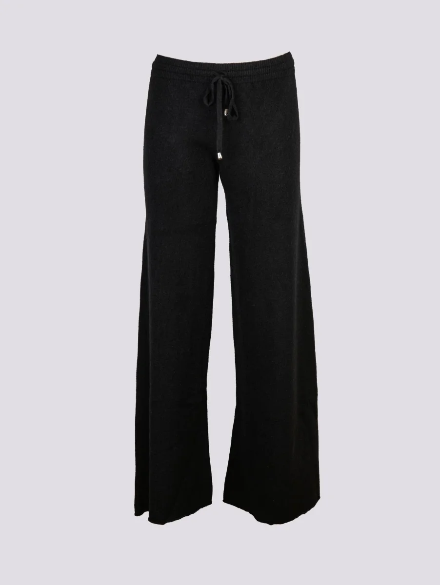 Pantalone a palazzo in maglia nero con coulisse e dettaglio a costine in vita.