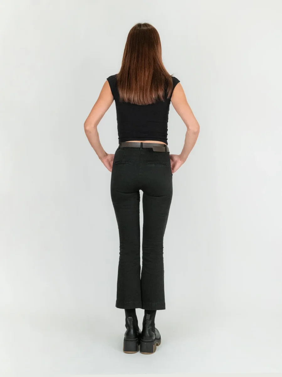 Tasca a filo laterale. Chiusura bottone frontale con zip in metallo a scomparsa.
