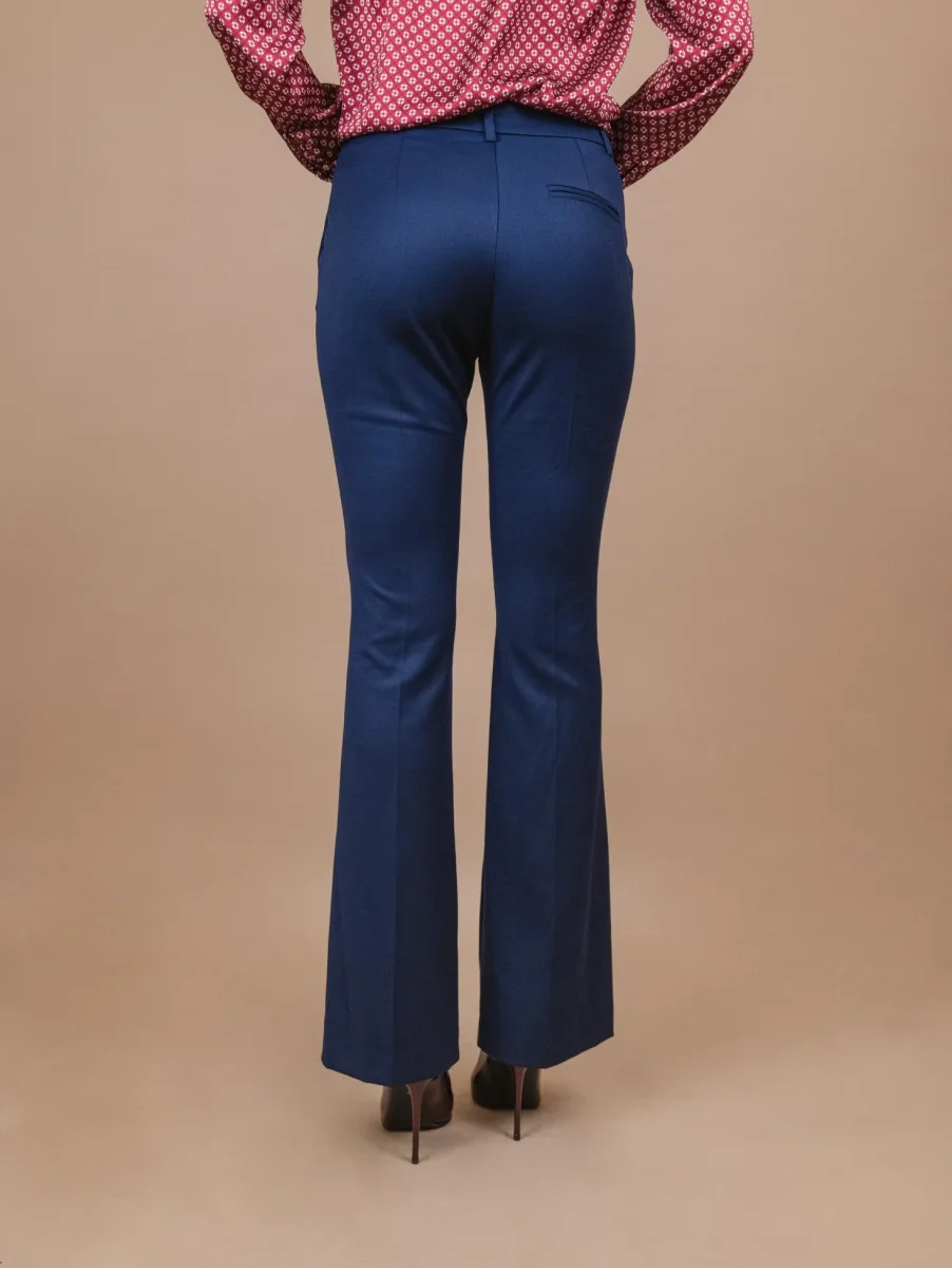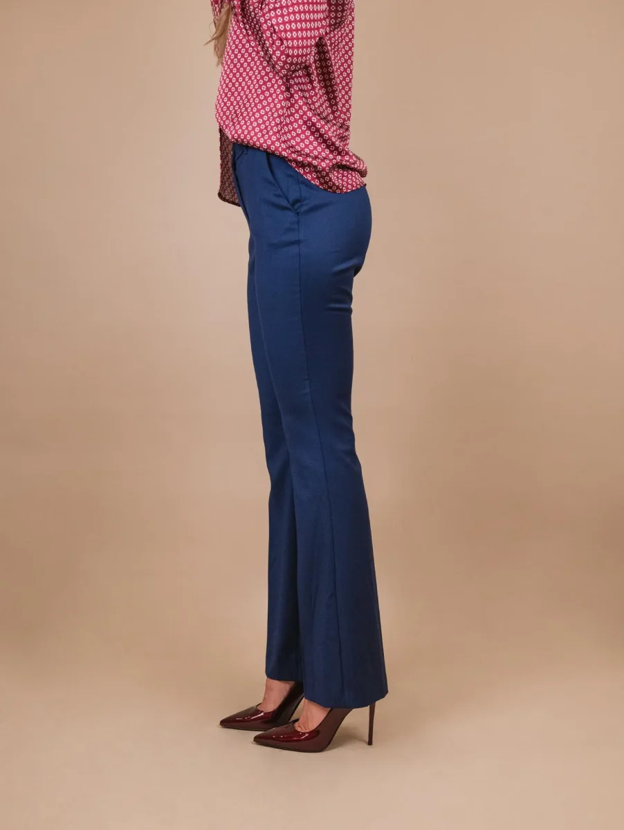 Pantalone a zampa in tessuto blu. Chiusura con bottone e zip frontale. Doppia tasca a filo laterale. Finta tasca applicata sul retro. Dettaglio passanti per cintura. Fondo a zampa. Vestibilità regolare leggermente elasticizzato. Peso medio. Composizione: 63% poliestere 34% viscosa 3% elastane. Peso medio. La modella è alta 1.79 e indossa una XS.
