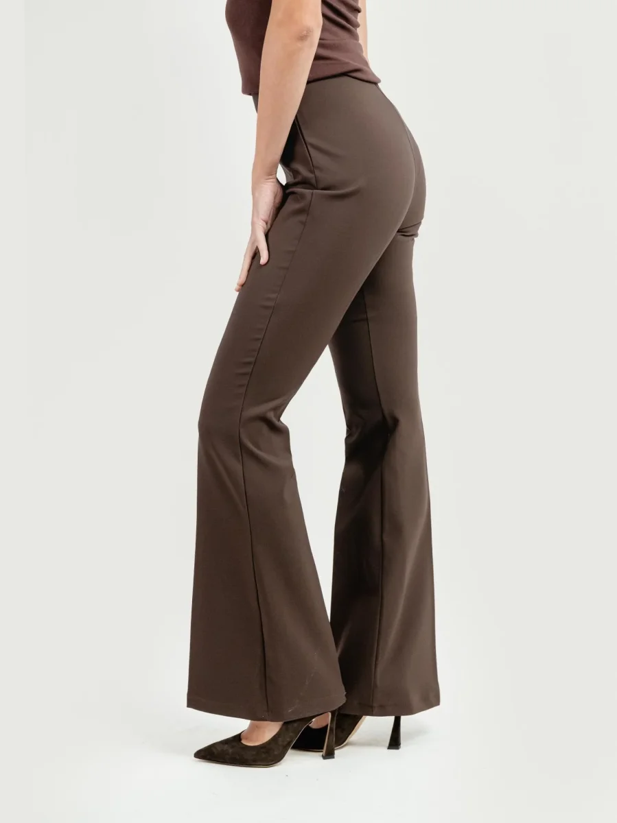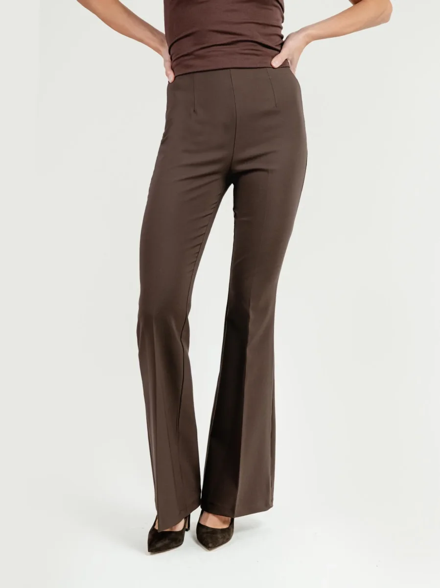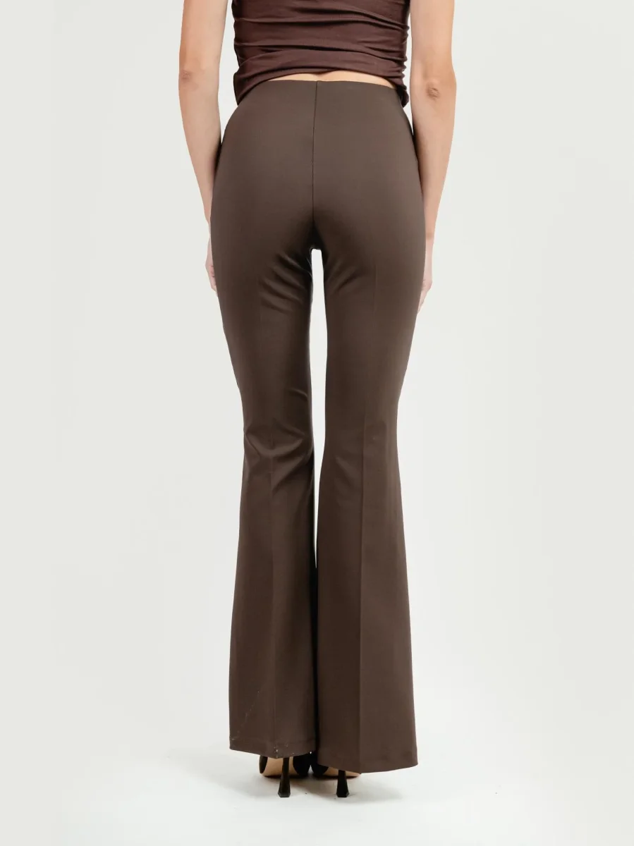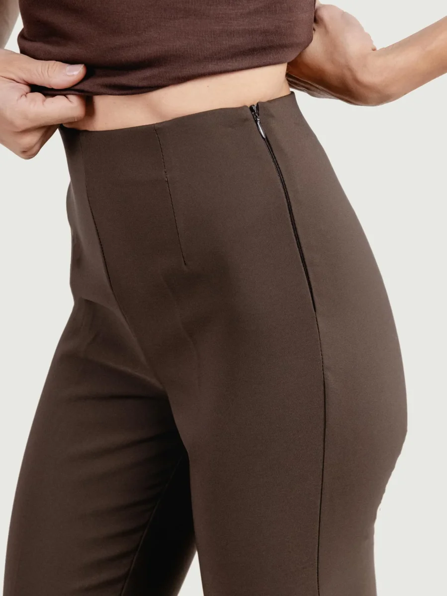 Pantalone a zampa in tessuto elastico con zip laterale a scomparsa.