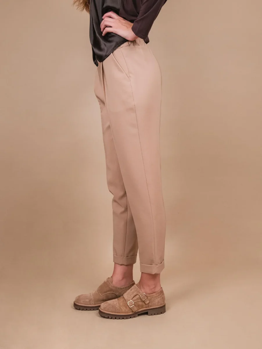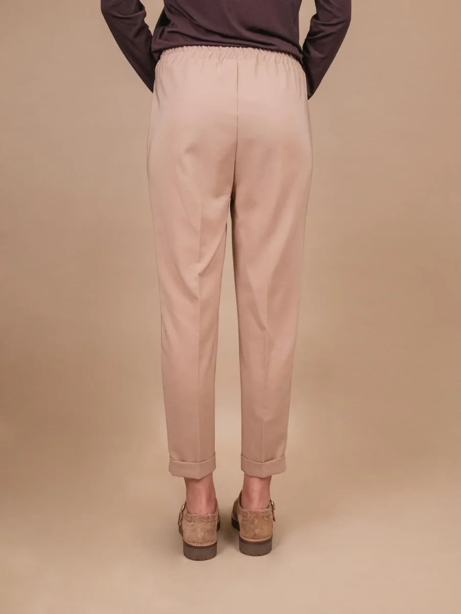 Pantalone con pinces in tessuto tecnico beige. Elastico in vita super confortevole. Tasca a filo laterale. Risvolto alla caviglia portabile a seconda delle preferenze. Composizione: 89% poliestere 11% elastane. Peso medio. La modella è alta 1.79 e indossa una S.