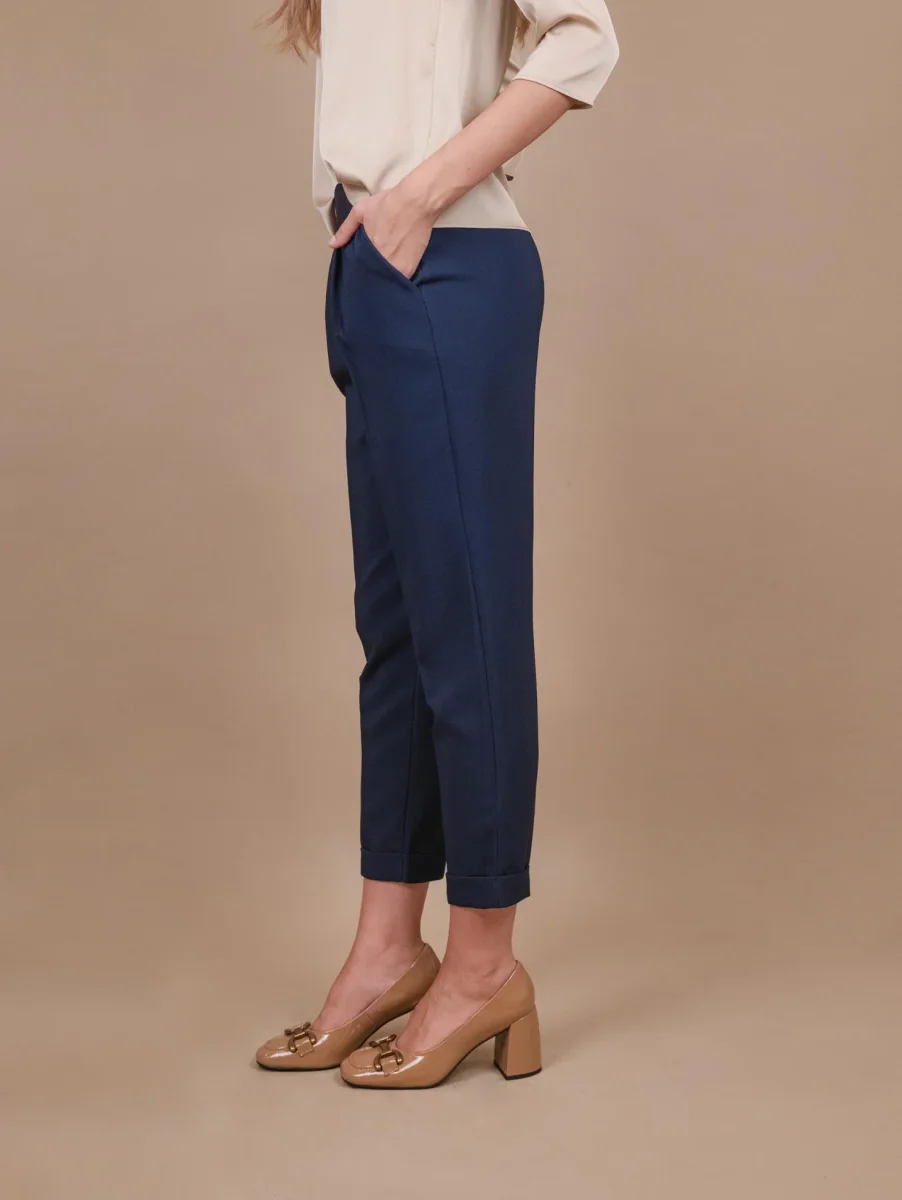 Pantalone con pinces in tessuto tecnico blu. Elastico in vita super confortevole. Tasca a filo laterale. Risvolto alla caviglia portabile a seconda delle preferenze. Composizione: 89% poliestere 11% elastane. Peso medio. La modella è alta 1.79 e indossa una S.