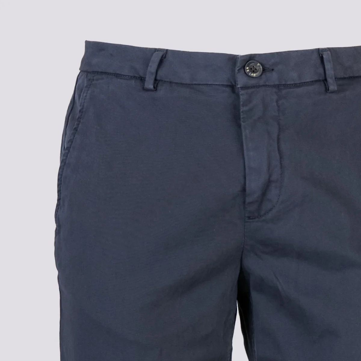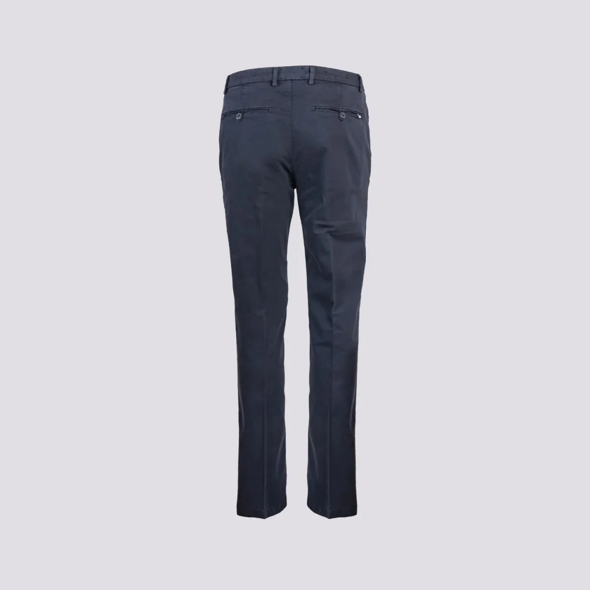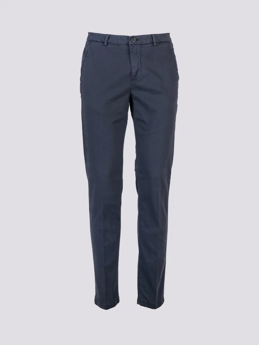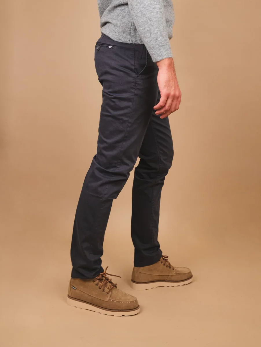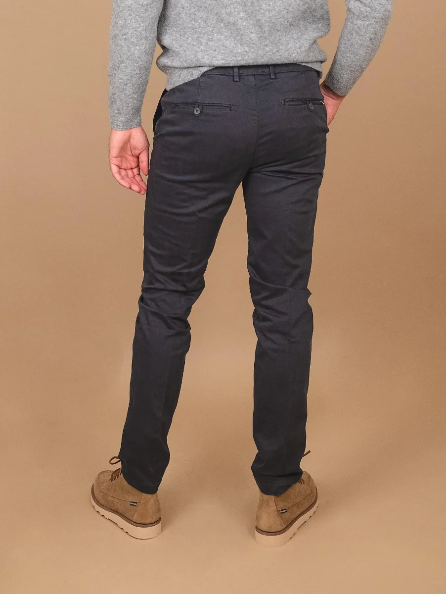 Pantalone in cotone blu scuro con tasca a filo laterale. Cotone invernale liscio taglio slim. Tessuto elasticizzato. Passanti per cintura. Peso medio. Vestibilità: slim fit