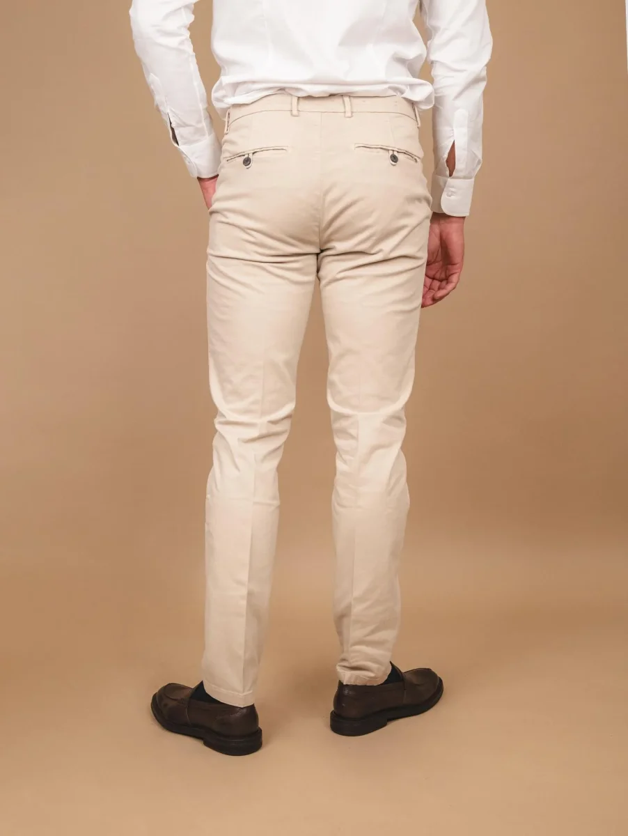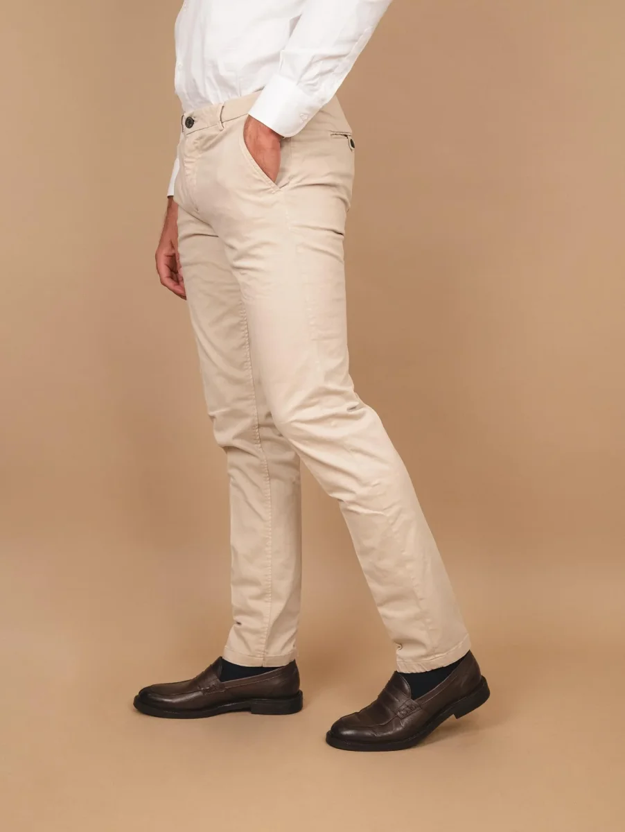 Pantalone in cotone beige con tasca a filo laterale. Cotone invernale liscio taglio slim. Tessuto elasticizzato. Passanti per cintura. Peso medio. Vestibilità: slim fit