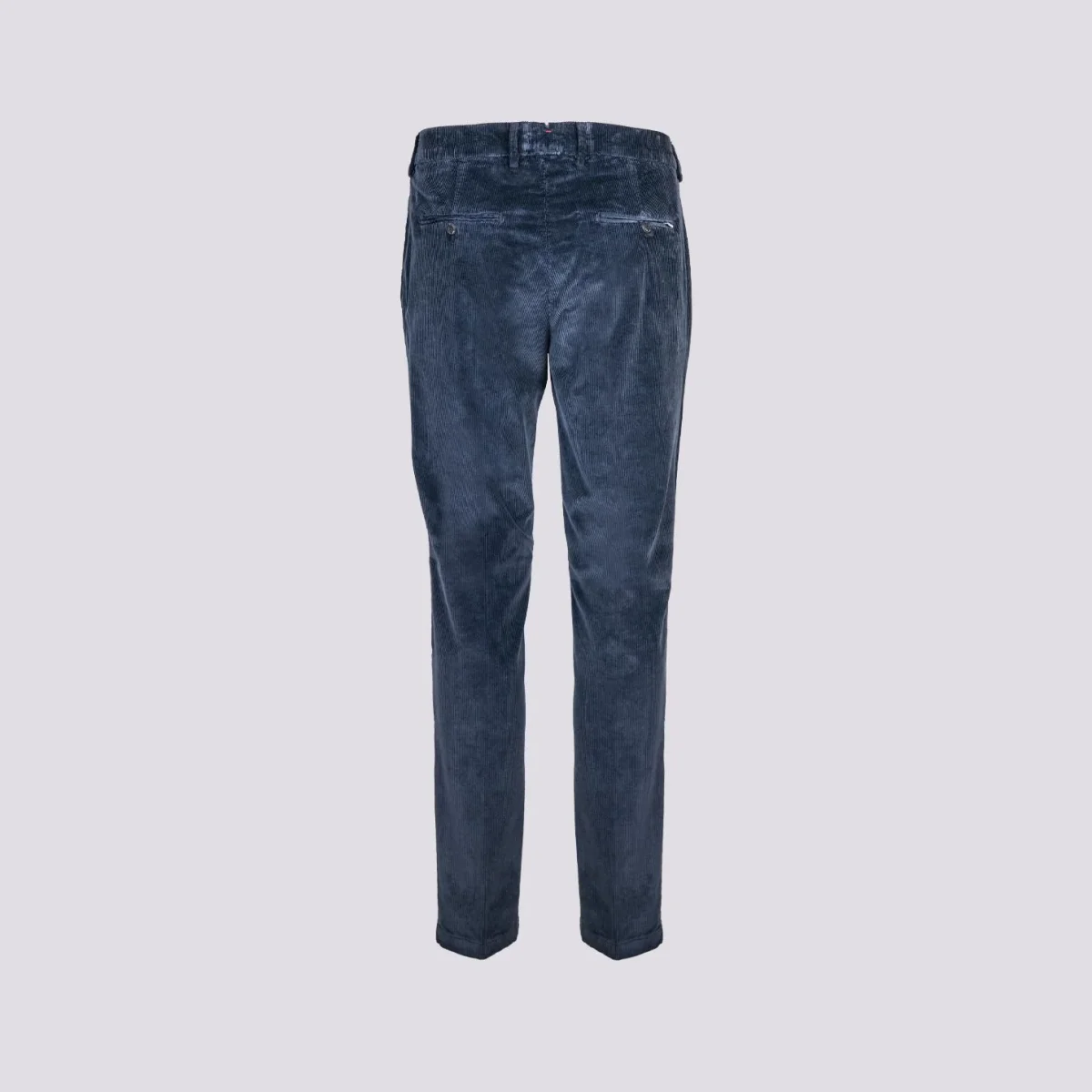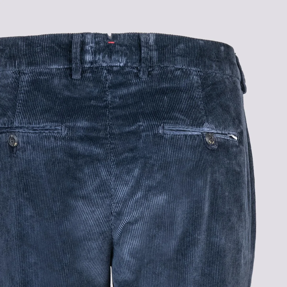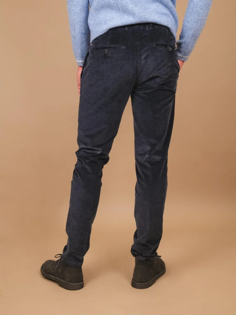 Pantalone in velluto blu navy con tasca a filo e chiusura con zip in metallo a scomparsa. Dettaglio passanti per cintura. Gambale 15 cm leggermente asciutto. Vestibilità regolare. Peso abbondante.