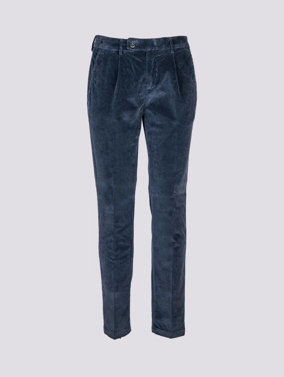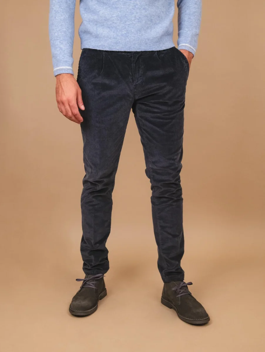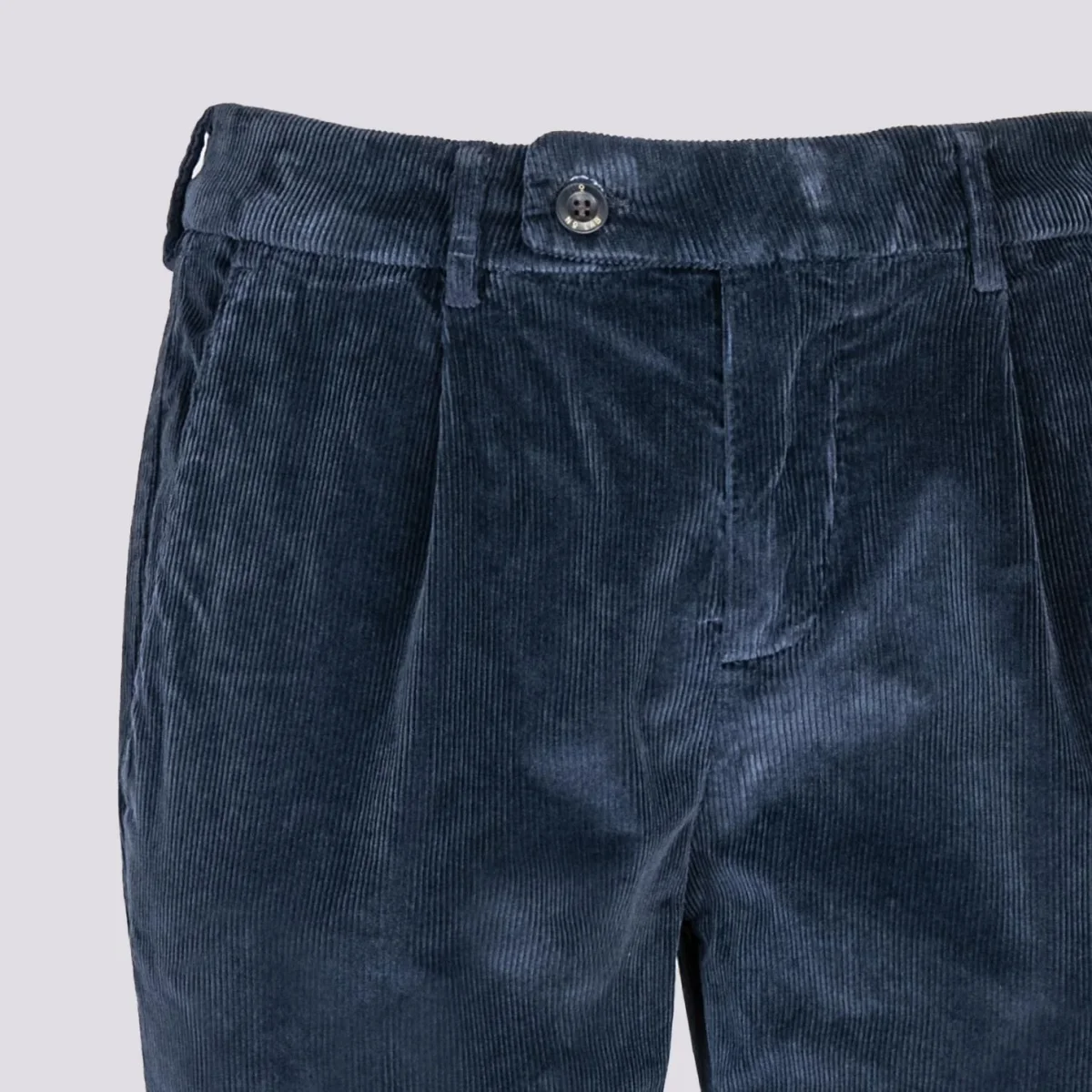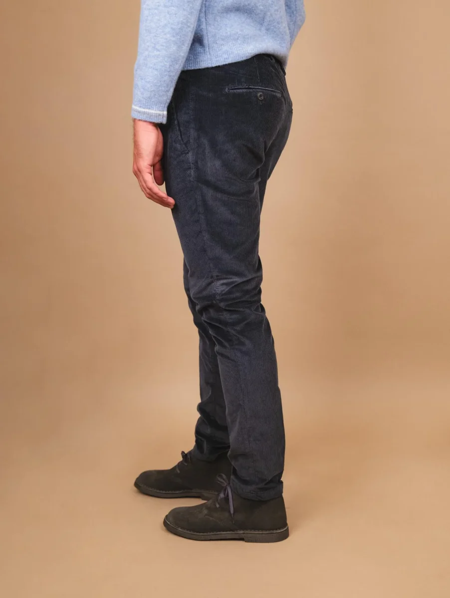 Pantalone in velluto blu navy con tasca a filo e chiusura con zip in metallo a scomparsa. Dettaglio passanti per cintura. Gambale 15 cm leggermente asciutto. Vestibilità regolare. Peso abbondante.