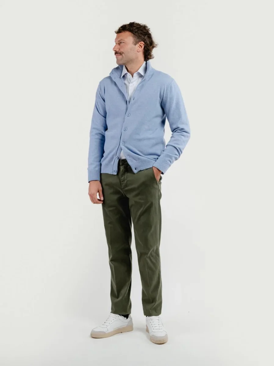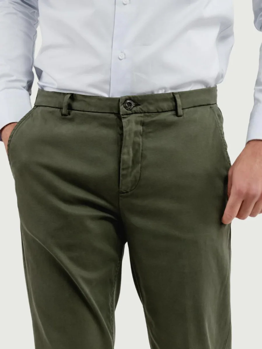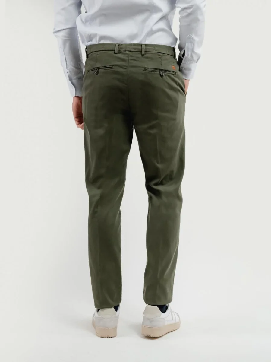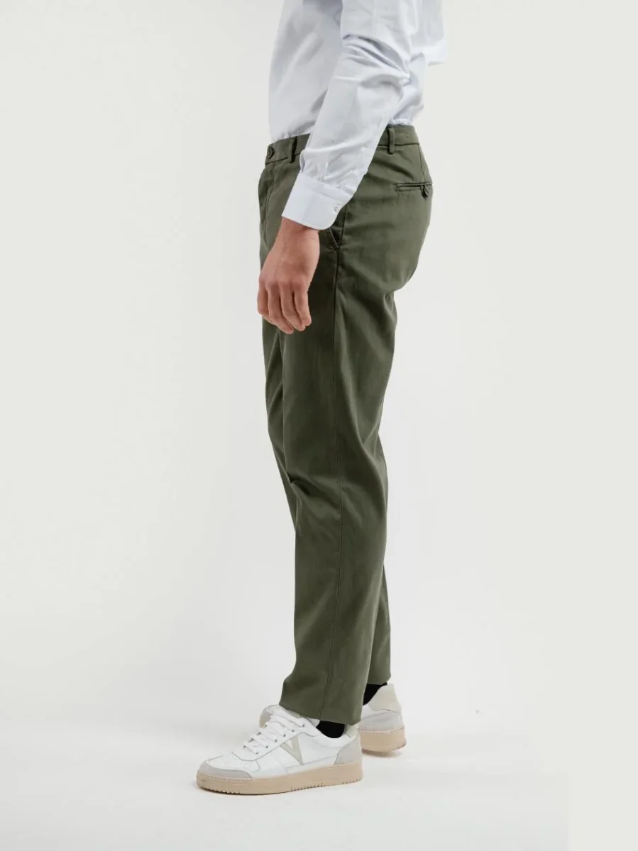 Pantalone in cotone leggermente elasticizzato con microtrama verde.