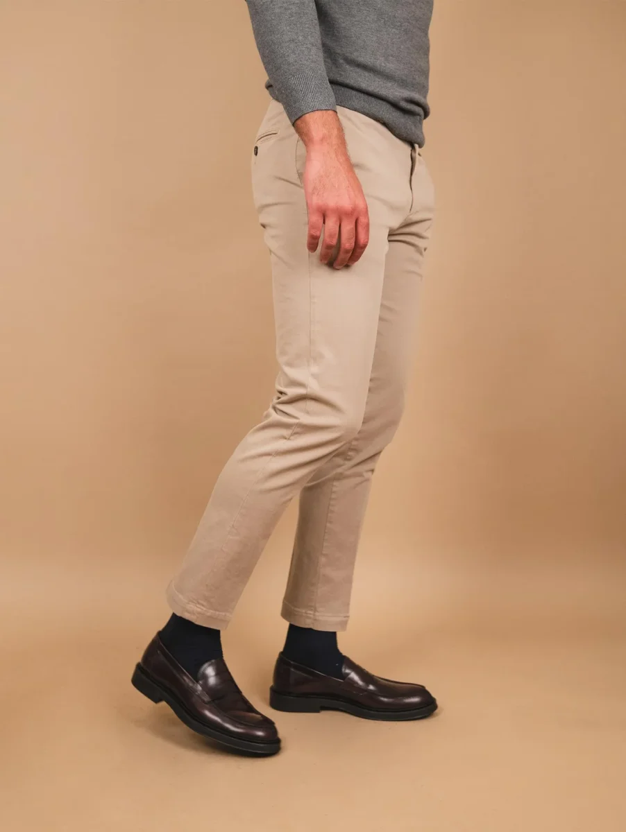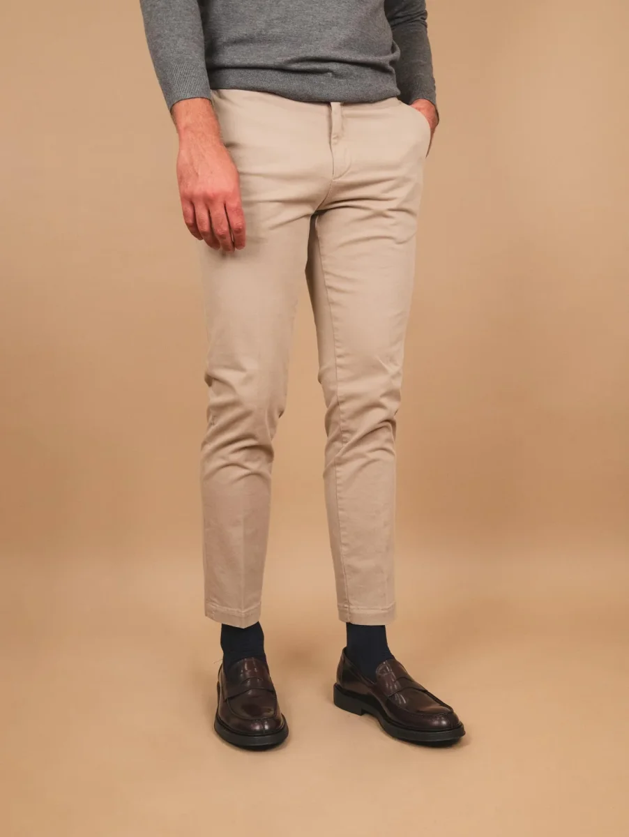 Pantalone con tasca a filo in cotone liscio beige. Vestibilità slim. Fondo 16 centimetri perfetto per chi ama portare pantaloni dalla vestibilità tendenzialmente skinny. Cuciture in tonalità. Passanti per cintura. Vestibilità regolare. Peso medio. Il modello è alto 1.83 cm e indossa una 46. Composizione: 97% cotone 3% elastane.