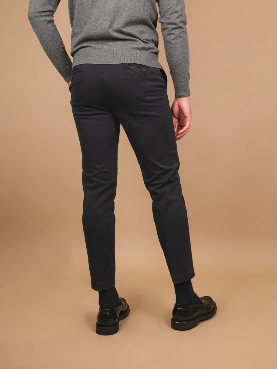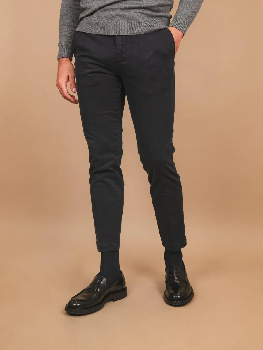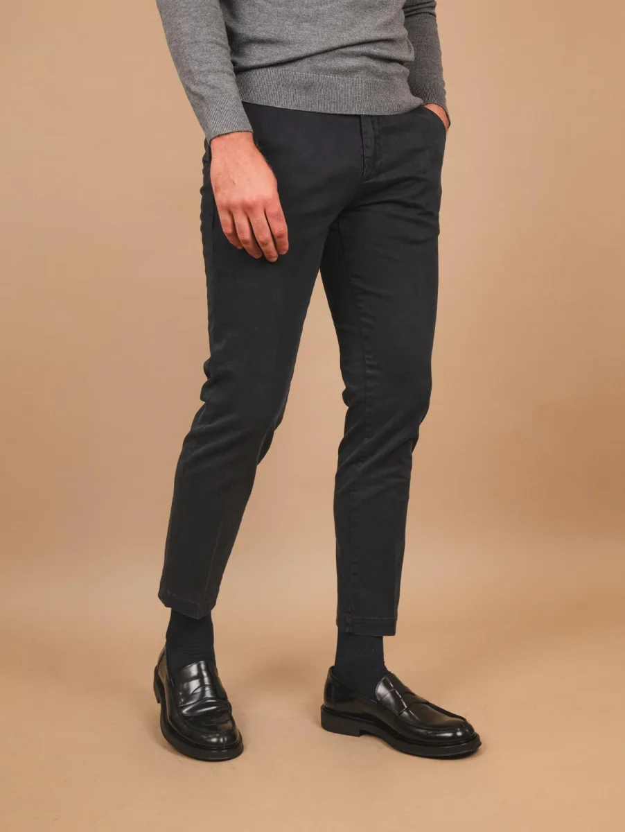 Pantalone con tasca a filo in cotone liscio blu. Vestibilità slim. Fondo 16 centimetri perfetto per chi ama portare pantaloni dalla vestibilità tendenzialmente skinny. Cuciture in tonalità. Passanti per cintura. Vestibilità regolare. Peso medio. Il modello è alto 1.83 cm e indossa una 46. Composizione: 97% cotone 3% elastane.