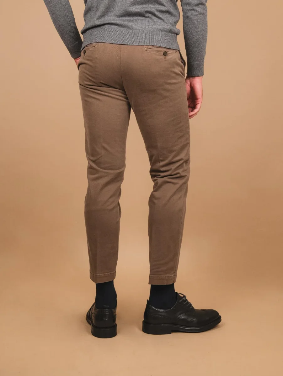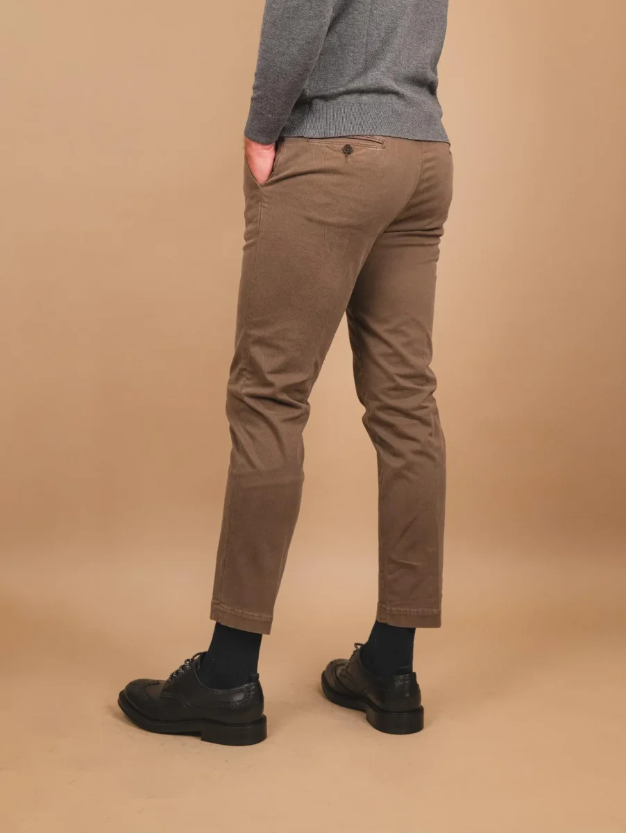 Pantalone con tasca a filo in cotone liscio color tortora. Vestibilità slim. Fondo 16 centimetri perfetto per chi ama portare pantaloni dalla vestibilità tendenzialmente skinny. Cuciture in tonalità. Passanti per cintura. Vestibilità regolare. Peso medio. Il modello è alto 1.83 cm e indossa una 46. Composizione: 97% cotone 3% elastane.
