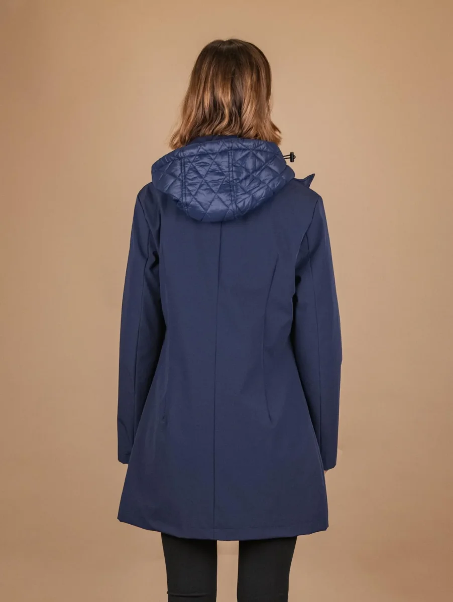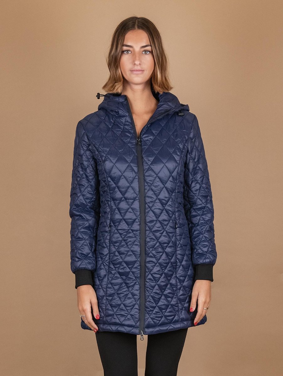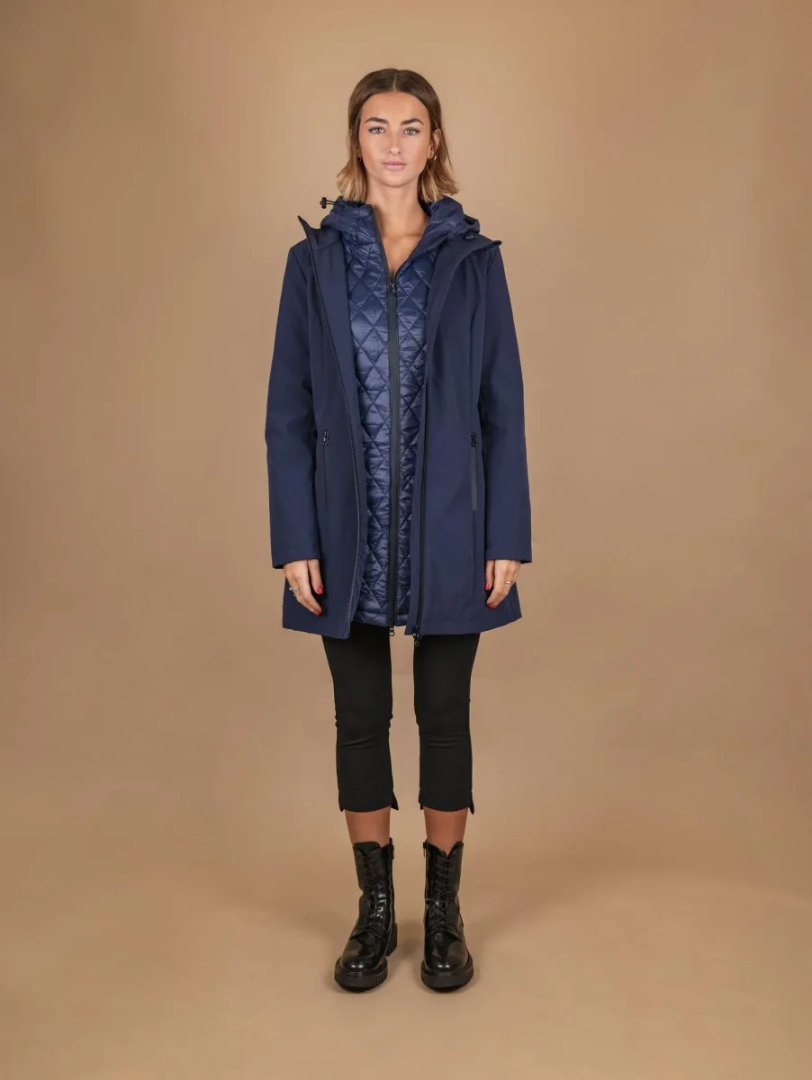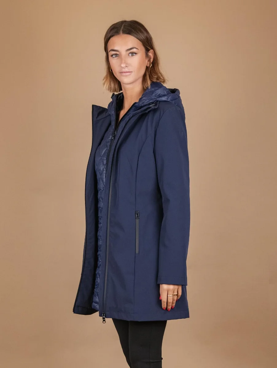 Parka con piumino estraibile in tessuto tecnico blu. Possibilità di strutturare il capo a seconda delle preferenze e delle temperature esterne. Chiusura zip a contrasto a scomparsa frontale. Doppia tasca a filo. Dettaglio elastici su entrambi i polsi per riparare il corpo dal freddo. La parte interna del capo può essere indossata singolarmente e presenta una lavorazione matelassè. Vestibilità regolare tendenzialmente slim. Peso abbondante. Composizione: 50% poliestere, 46% nylon, 4% spandex. La modella è alta 1.81 cm e indossa una S.