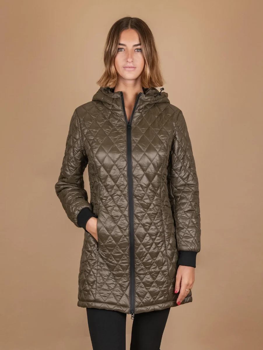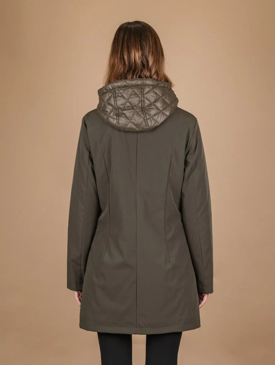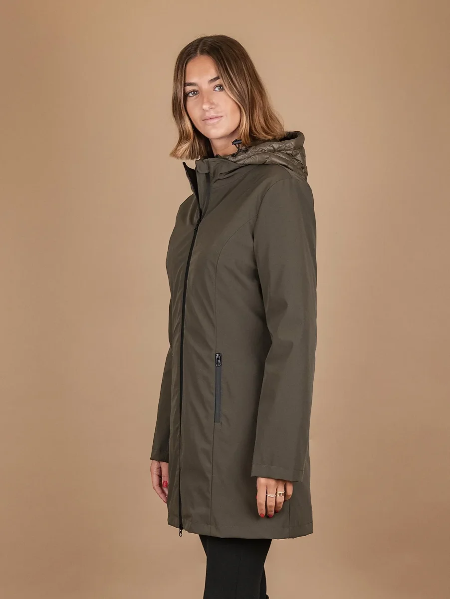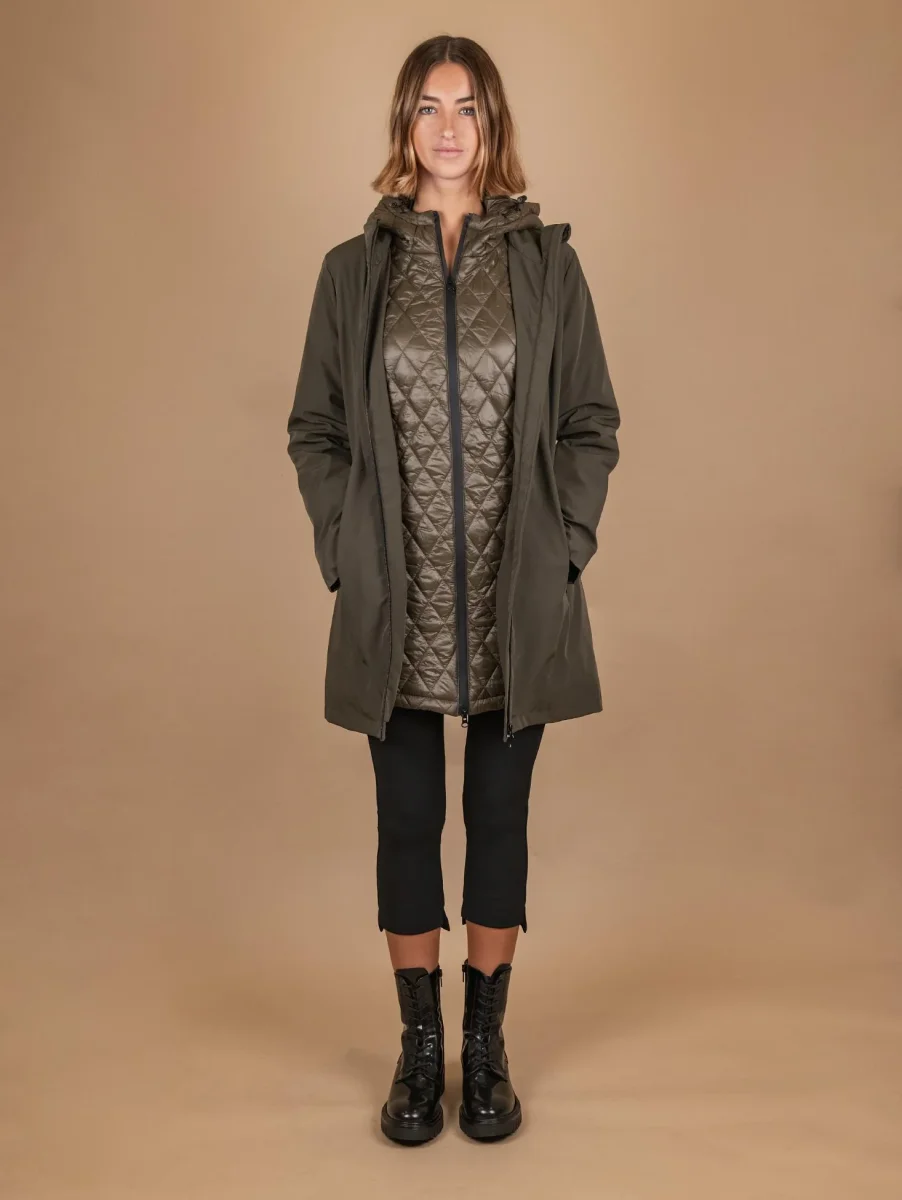 Parka con piumino estraibile in tessuto tecnico verde militare. Possibilità di strutturare il capo a seconda delle preferenze e delle temperature esterne. Chiusura zip a contrasto a scomparsa frontale. Doppia tasca a filo. Dettaglio elastici su entrambi i polsi per riparare il corpo dal freddo. La parte interna del capo può essere indossata singolarmente e presenta una lavorazione matelassè. Vestibilità regolare tendenzialmente slim. Peso abbondante. Composizione: 50% poliestere, 46% nylon, 4% spandex. La modella è alta 1.81 cm e indossa una S.