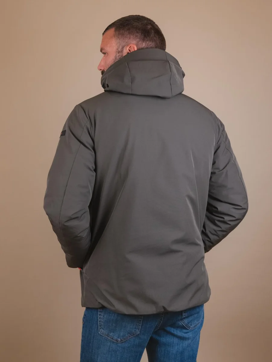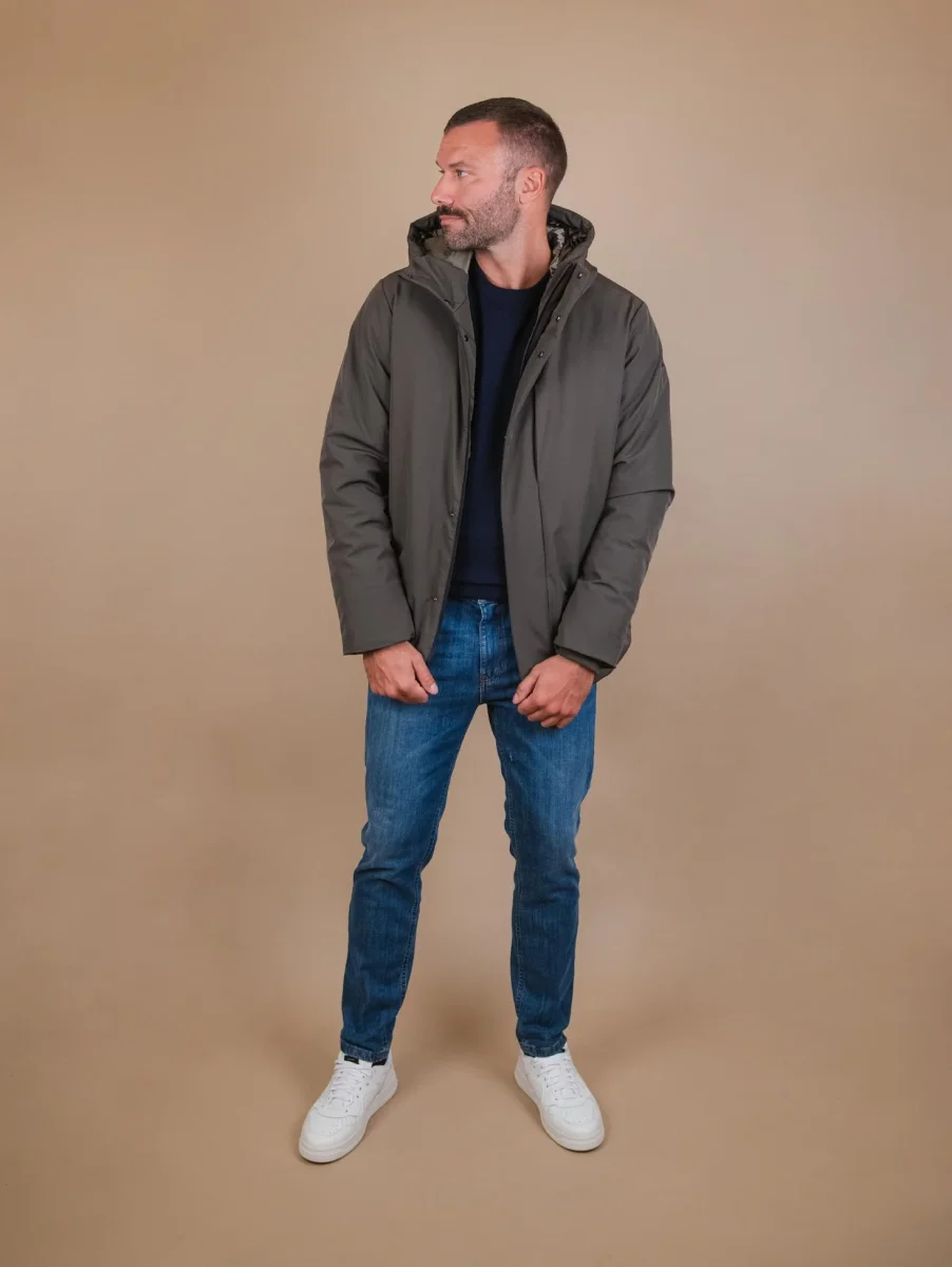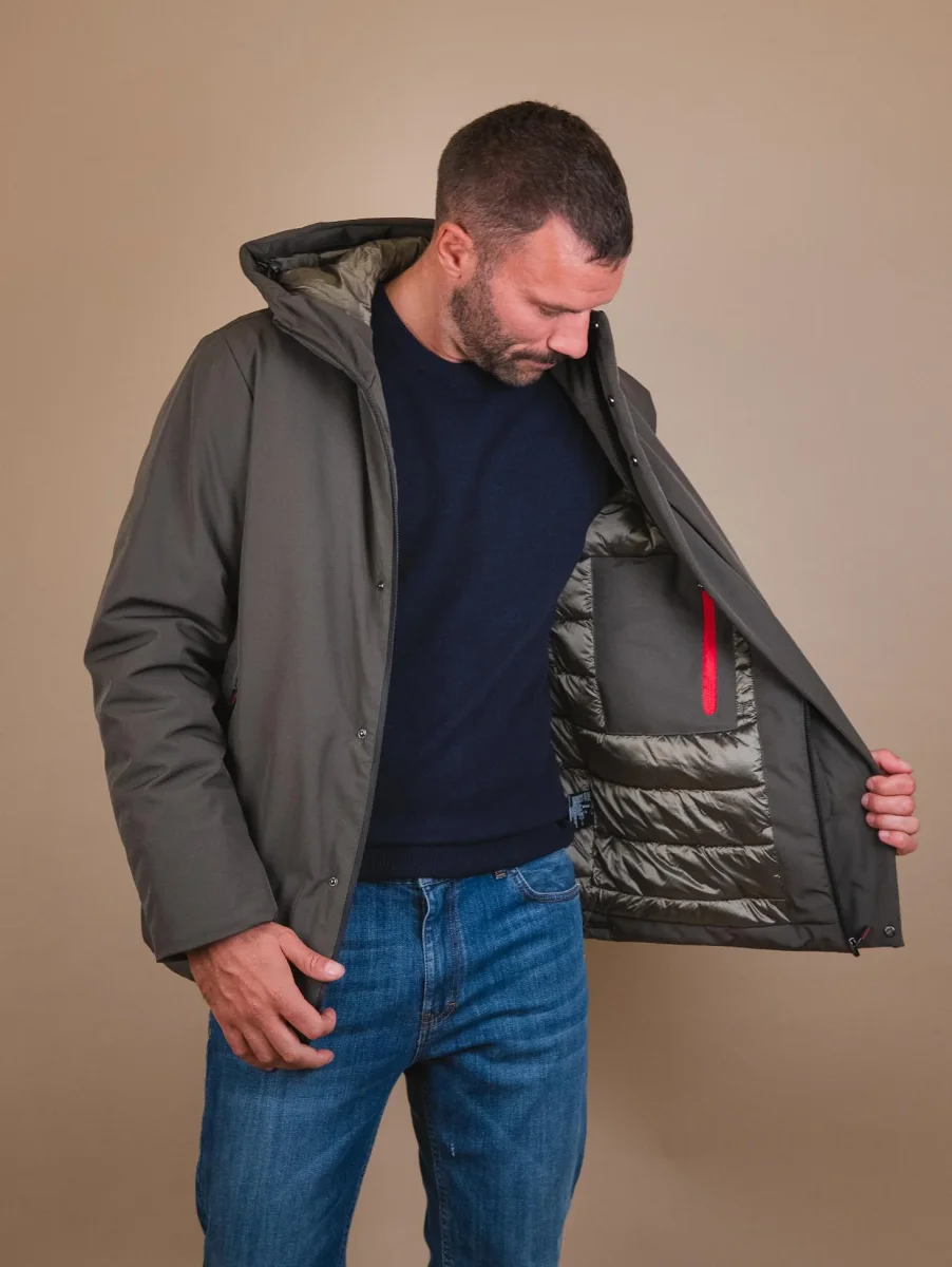 Parka da uomo verde militare con esterno in poliestere elasticizzato. Imbottitura in 100% poliestere, come anche l’esterno, che tuttavia presenta anche una finitura bio elasticizzata. La fodera in nylon brillante. Il cappuccio è integrato e presenta un cordoncino, una chiusura a zip nascosta e automatici in aggiunta. Doppia tasca esterna con zip e una tasca interna, anch’essa con zip. Polsino a costine all’interno del fondo della manica. Vestibilità regolare. Peso abbondante. Il modello è alto 1.87 e indossa una 50.