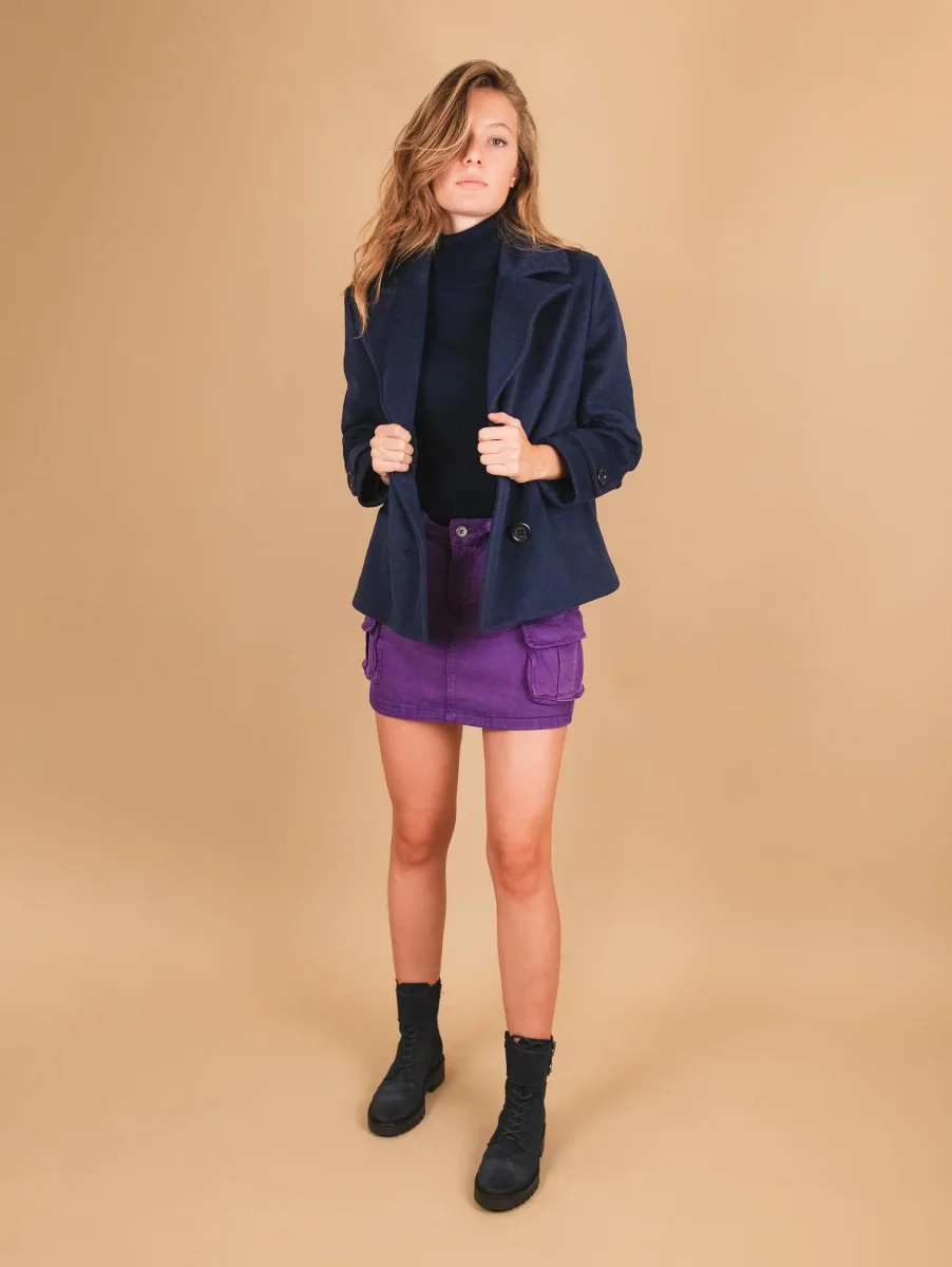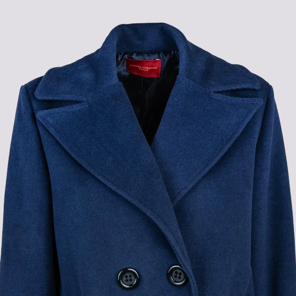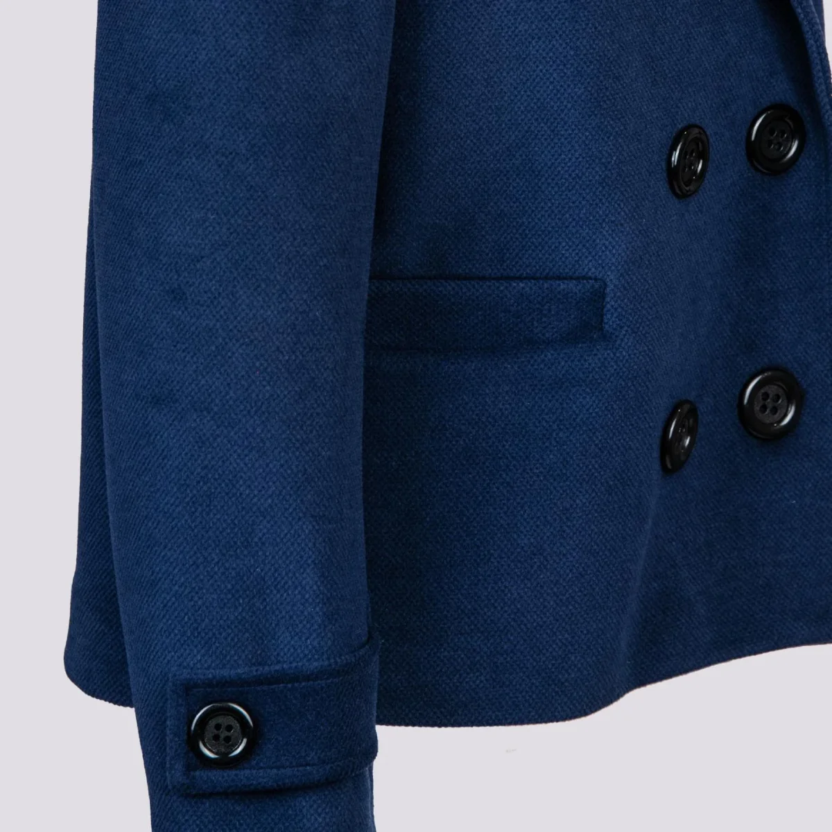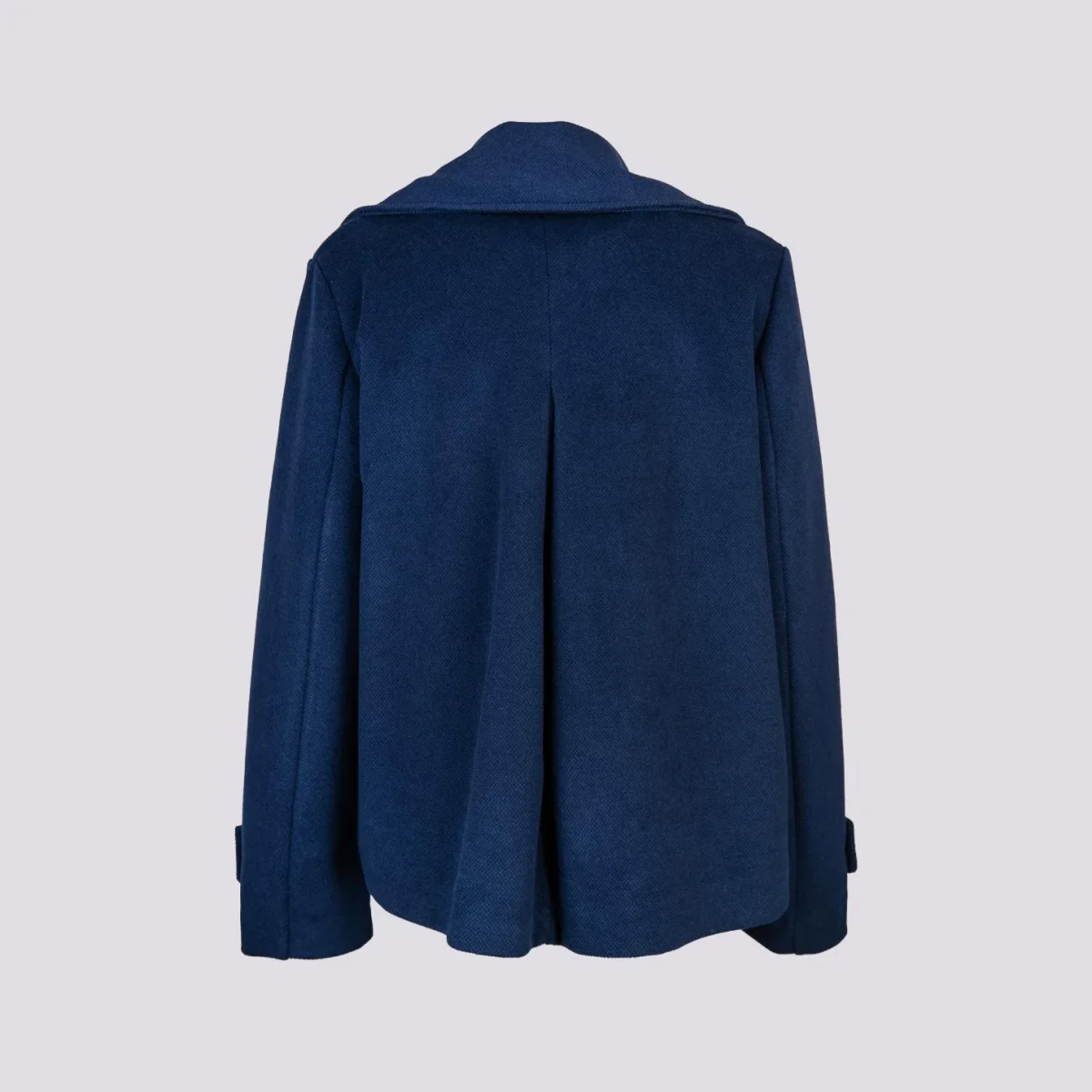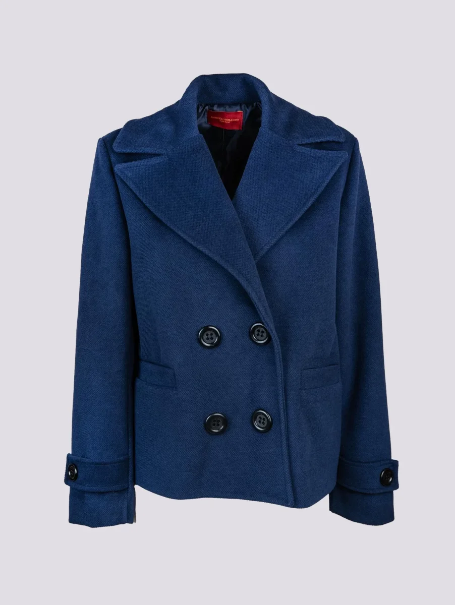 Peacoat doppiopetto oversize blu con maxi rever. Il capo perfetto da indossare in autunno. Doppia tasca frontale cucita con possibilità di apertura. Dettaglio bottone su entrambi i polsi. La vestibilità over di questo capo viene smorzata dalla lunghezza del capo che non essendo lungo rende più simmetriche le proporzioni. Fodera interna in tonalità. Bottoni neri a contrasto. Vestibilità over. Peso medio.