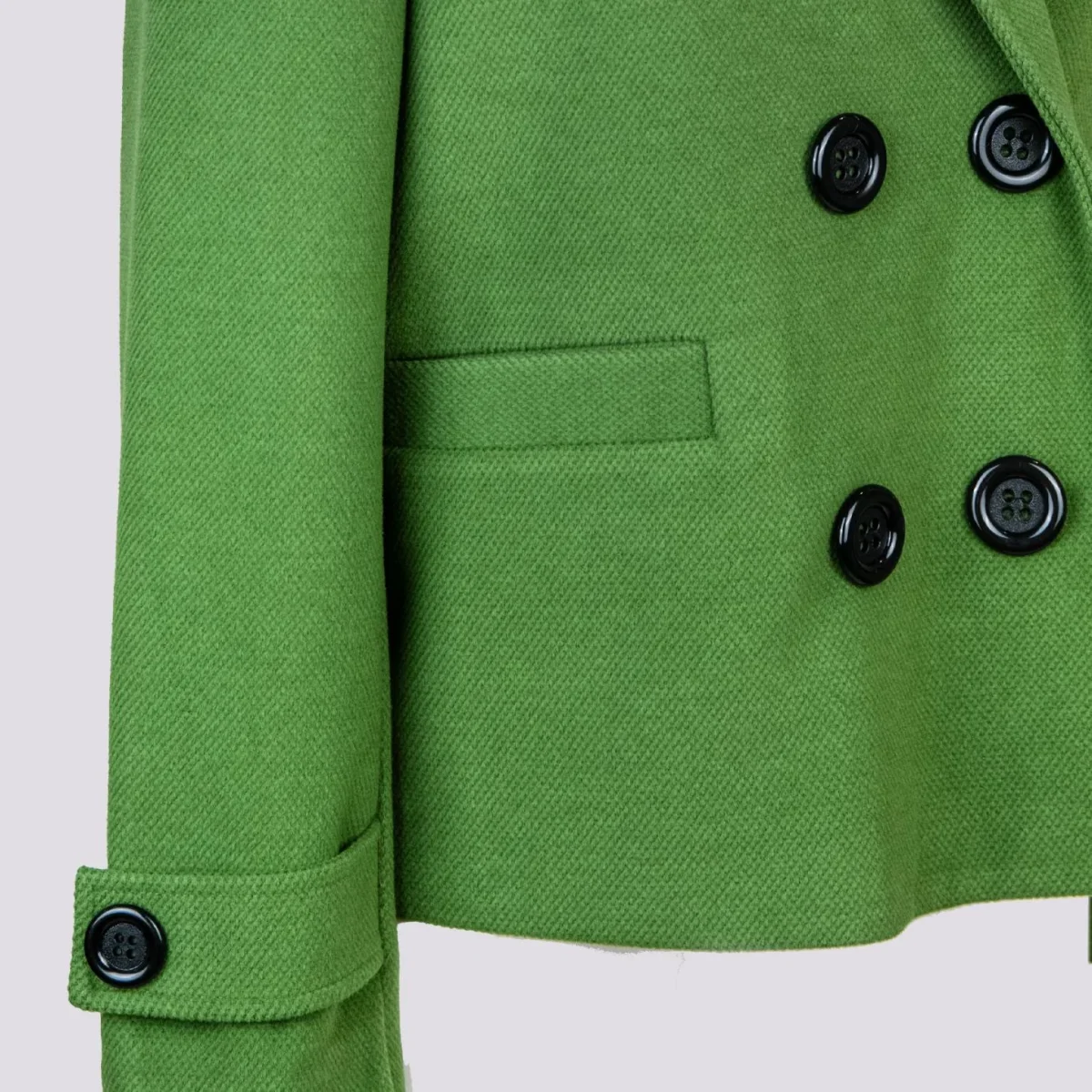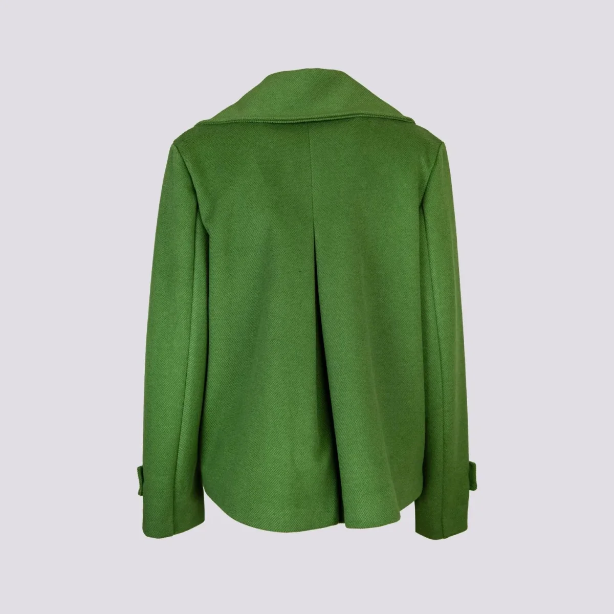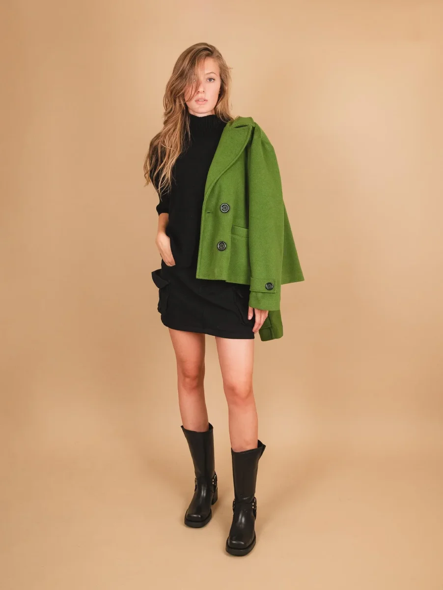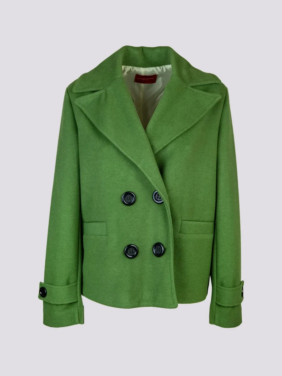 Peacoat doppiopetto oversize verde con maxi rever. Il capo perfetto da indossare in autunno. Doppia tasca frontale cucita con possibilità di apertura. Dettaglio bottone su entrambi i polsi. La vestibilità over di questo capo viene smorzata dalla lunghezza del capo che non essendo lungo rende più simmetriche le proporzioni. Fodera interna in tonalità. Bottoni neri a contrasto. Vestibilità over. Peso medio.