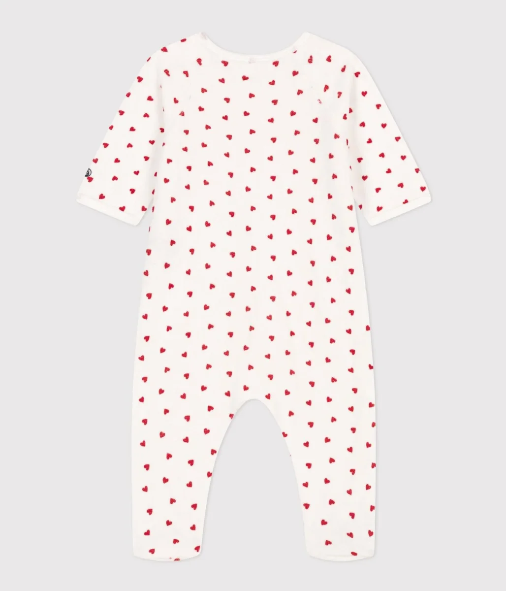 Tutina pigiama unisex in ciniglia, un materiale morbido che terrà il bambino al caldo nelle notti invernali. Apertura del pigiama con bottoni automatici sul lato.